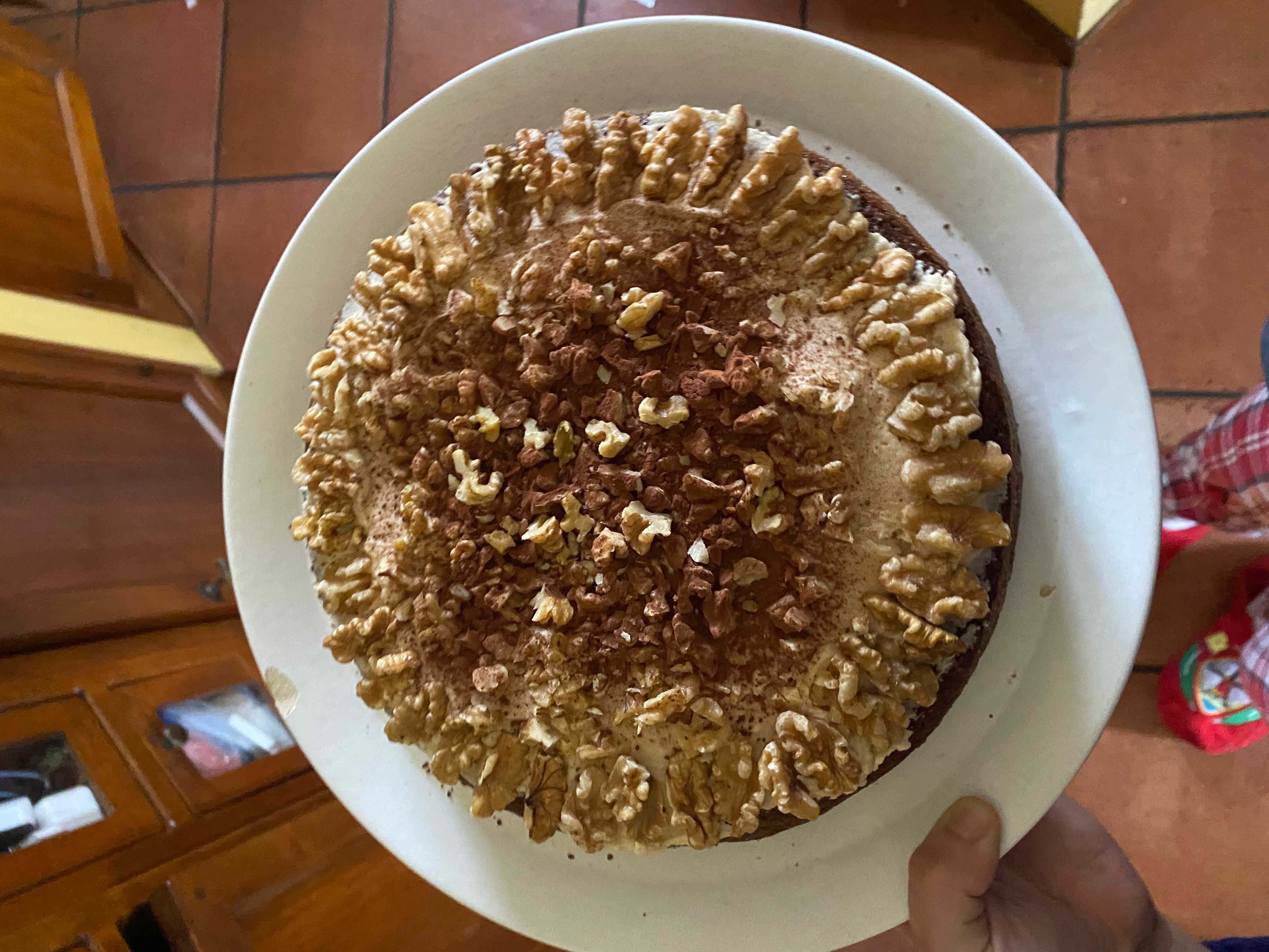 A timeless British tea-time favorite, this coffee and walnut cake features a light, moist sponge infused with espresso and studded with crunchy chopped walnuts. It is generously topped with a smooth coffee buttercream frosting and decorated with walnut halves and a dusting of cocoa, just like the image.