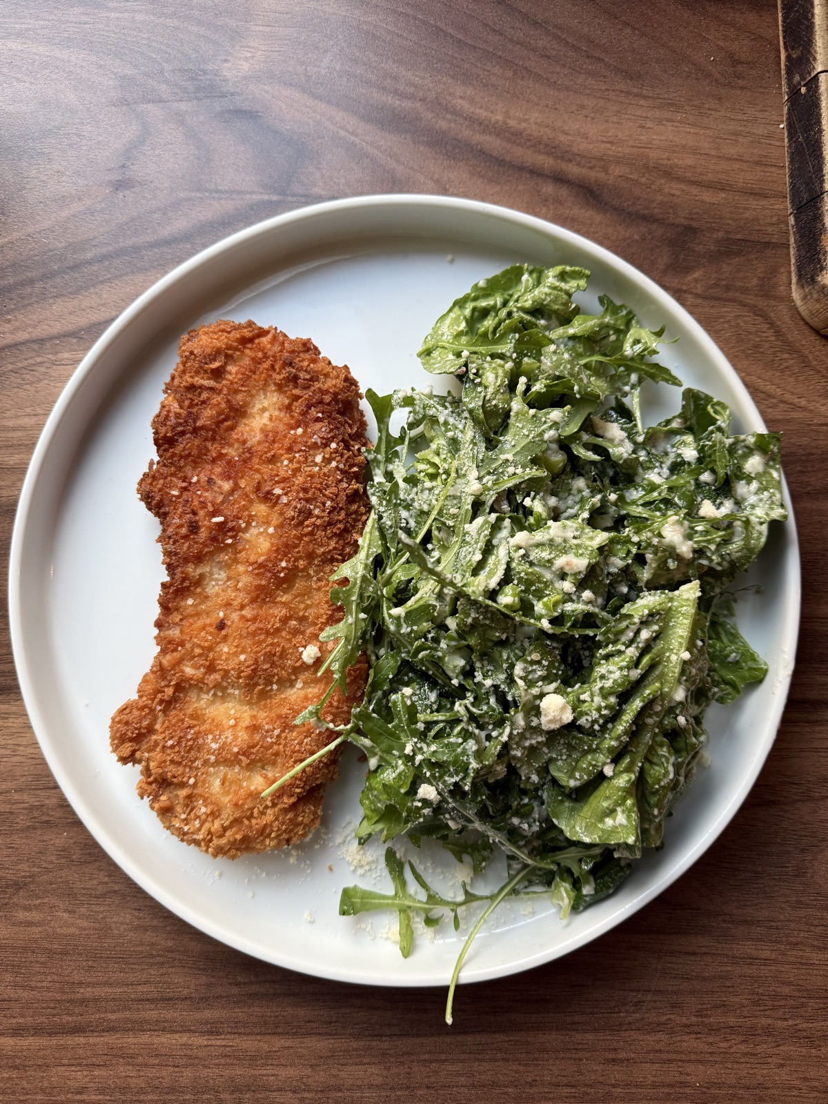 Panko breaded chicken schnitzel with a quick green salad in Caesar-esque salad