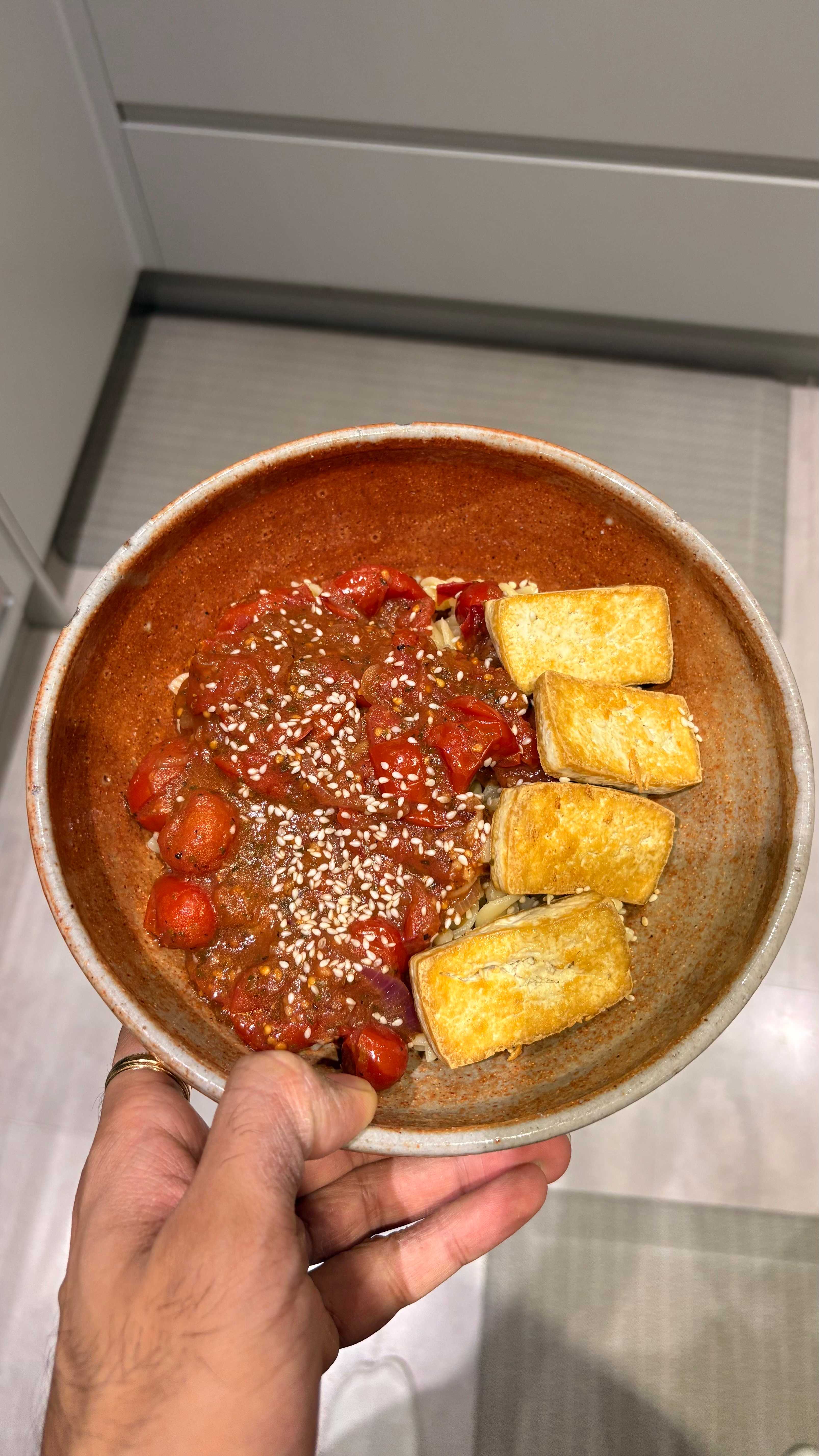 A comforting and vibrant fusion dish featuring crispy, golden pan-fried tofu slices served over tender noodles. The dish is brought together by a rich, chunky homemade sauce made from burst cherry tomatoes and red onions, finished with a generous sprinkling of sesame seeds for nuttiness and texture.
