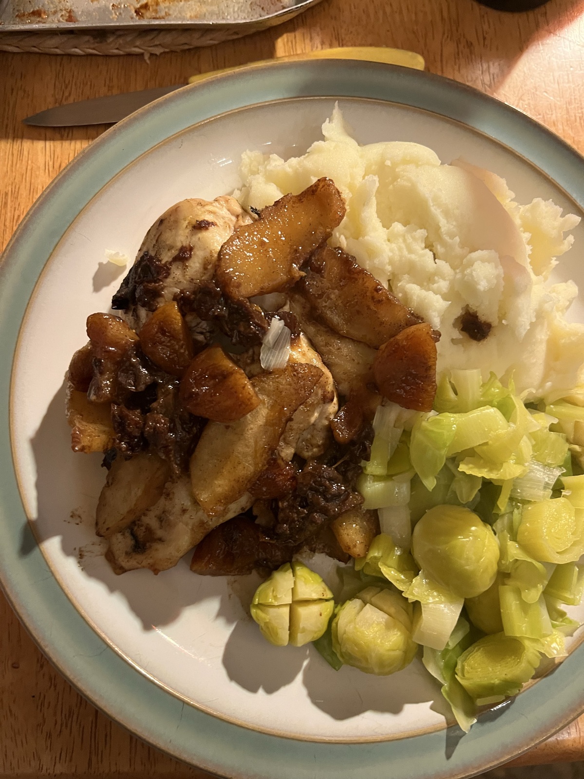 chicken w/ cider & fruit sauce, mash, leeks and sprouts