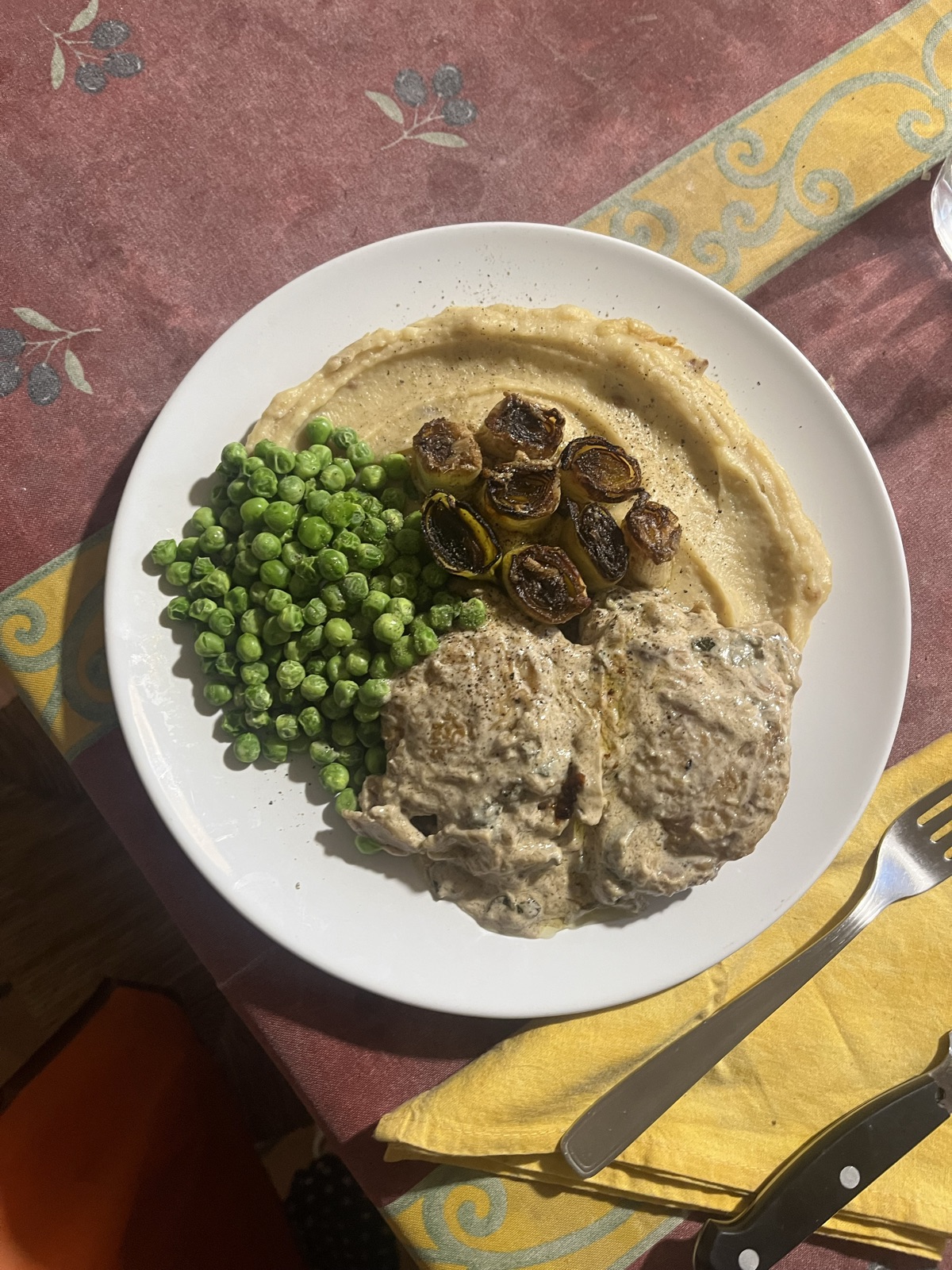 Chicken thighs with porcini and sage, braised leeks with sage and anchovies and cream and potato and peas