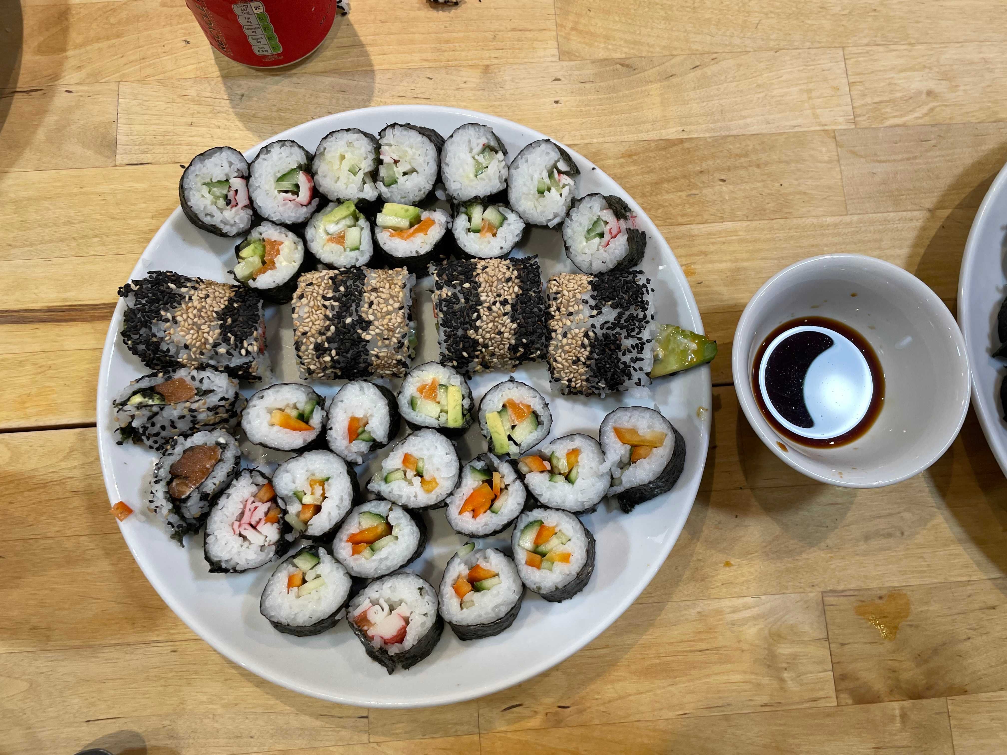 Recreate the fun of a sushi cooking class at home with this varied platter of sushi rolls. Based on the provided images, this recipe guides you through making seasoned sushi rice and creating two popular styles: classic Maki (seaweed outside) and Uramaki (inside-out rolls with sesame seeds). The fillings feature a fresh assortment of salmon, crab sticks, and crunchy vegetables like cucumber and peppers, perfect for a group cooking party.