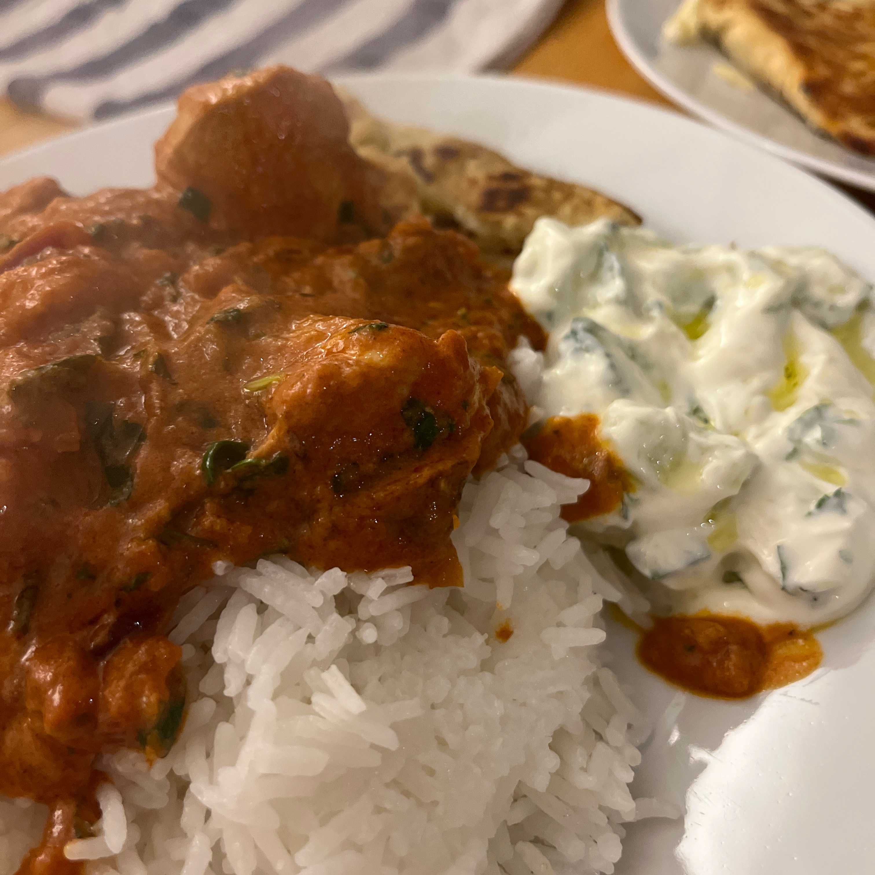 creamy butter chicken with garlic naan and cucumber raita