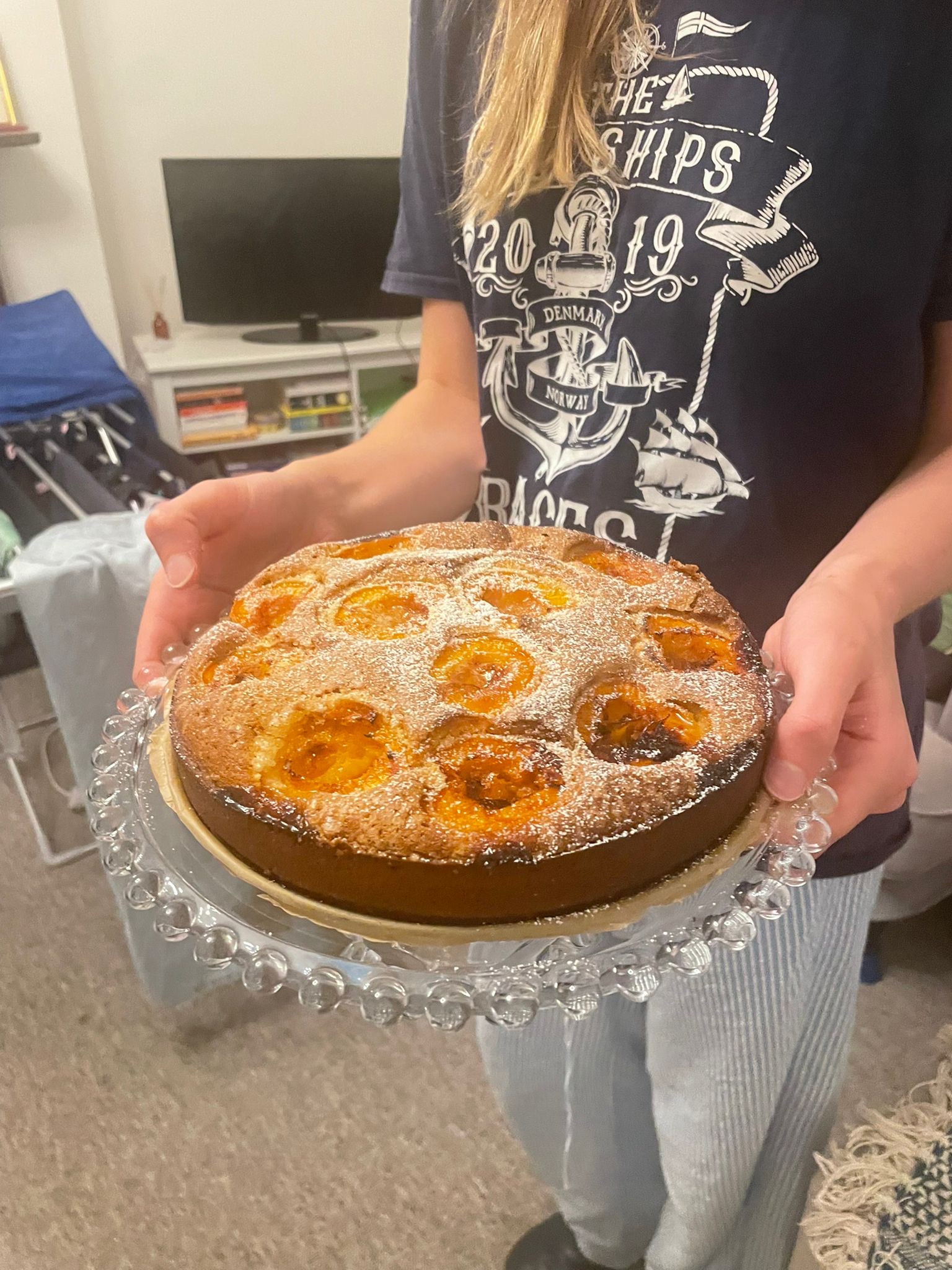 A classic German 'Versunkener Aprikosenkuchen' (sunken apricot cake) featuring a moist, buttery sponge base topped with fresh, tart apricot halves. As noted in your context, the contrast between the sweet cake batter and the sour fruit is the highlight of this dish. The apricots are placed cut-side up to hold their juices, baking into jammy pockets of flavor. Finished with a dusting of powdered sugar.
