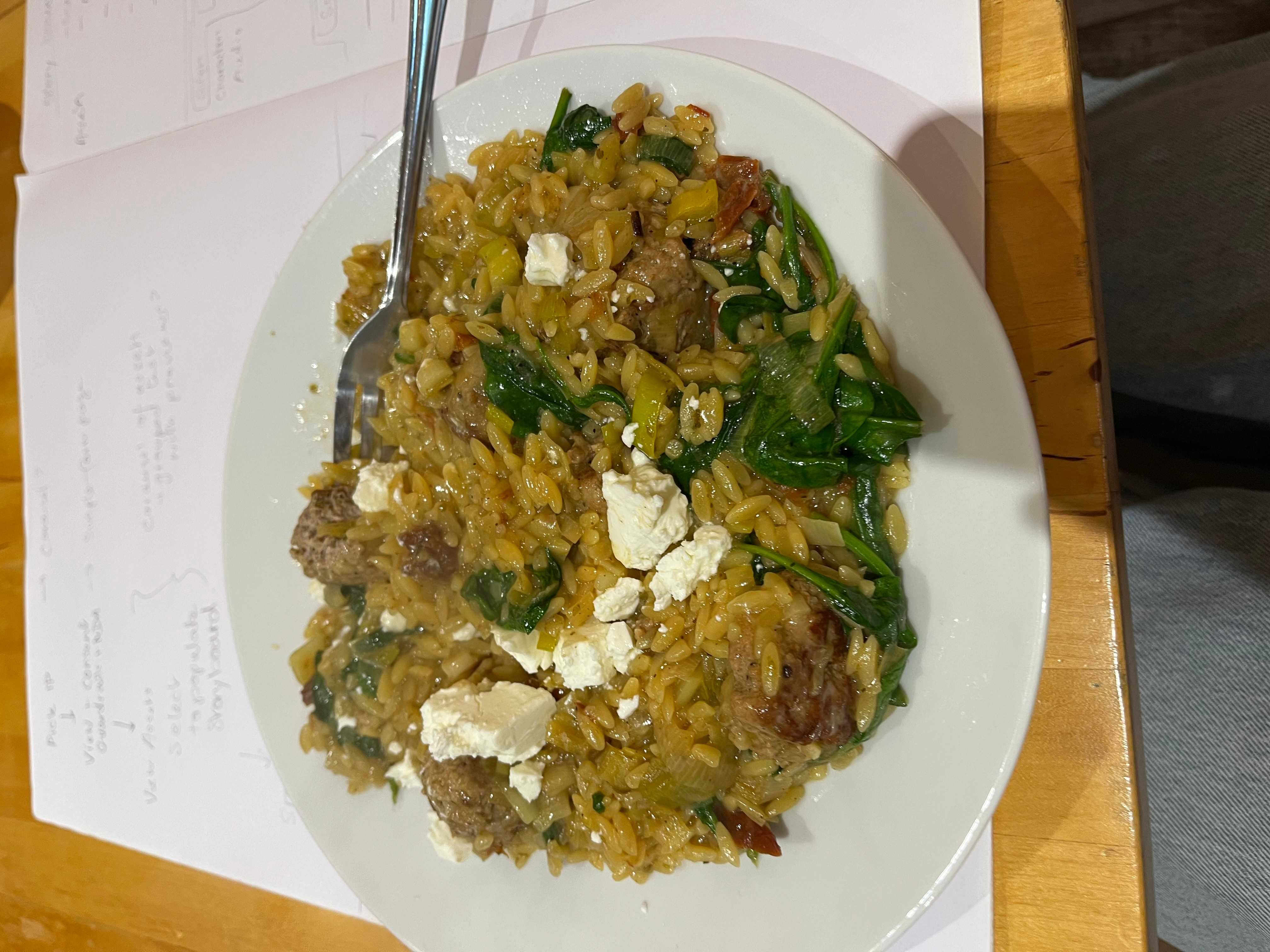 one-pan meatball and orzo with leeks, spinach, and feta