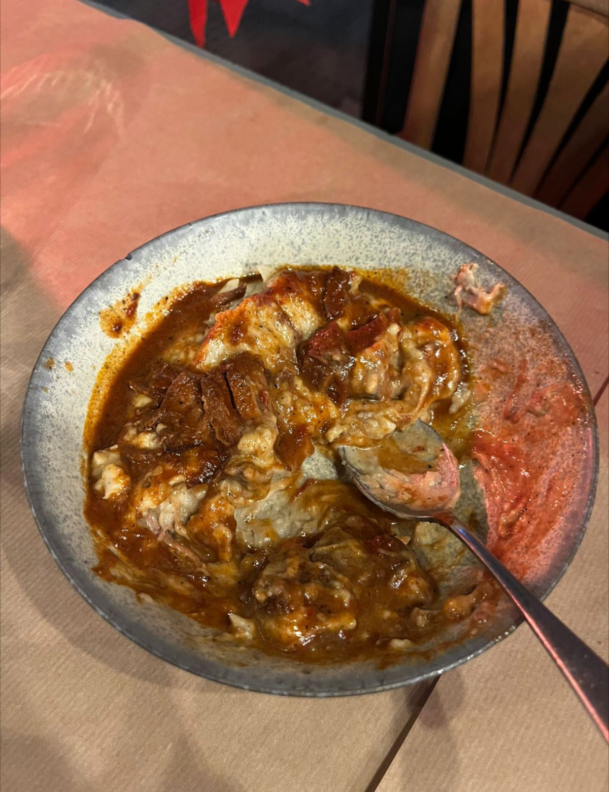 A signature dish from Mavro Provato of Press Café featuring tender braised veal in a rich tomato sauce (kokkinisto) served over a creamy, smoky eggplant and cheese béchamel puree.