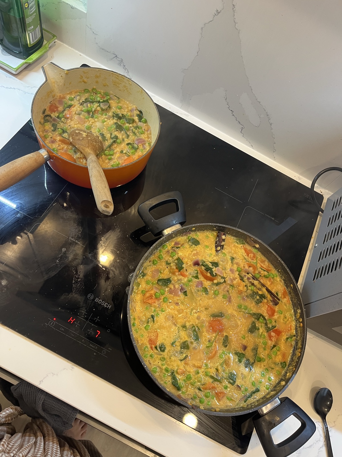 With coriander, cumin and cardamom seeds, cinnamon sticks, garlic, ginger , red onion, and some coconut milk.