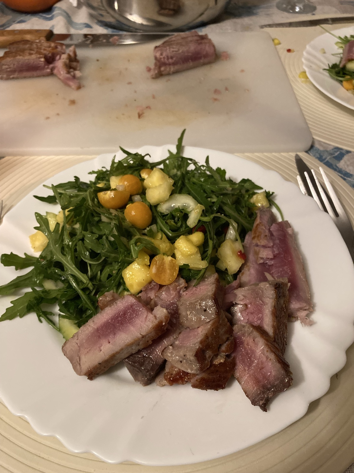 Fresh physalis, mango, pineapple and chilli salad with line caught tuna steaks.
