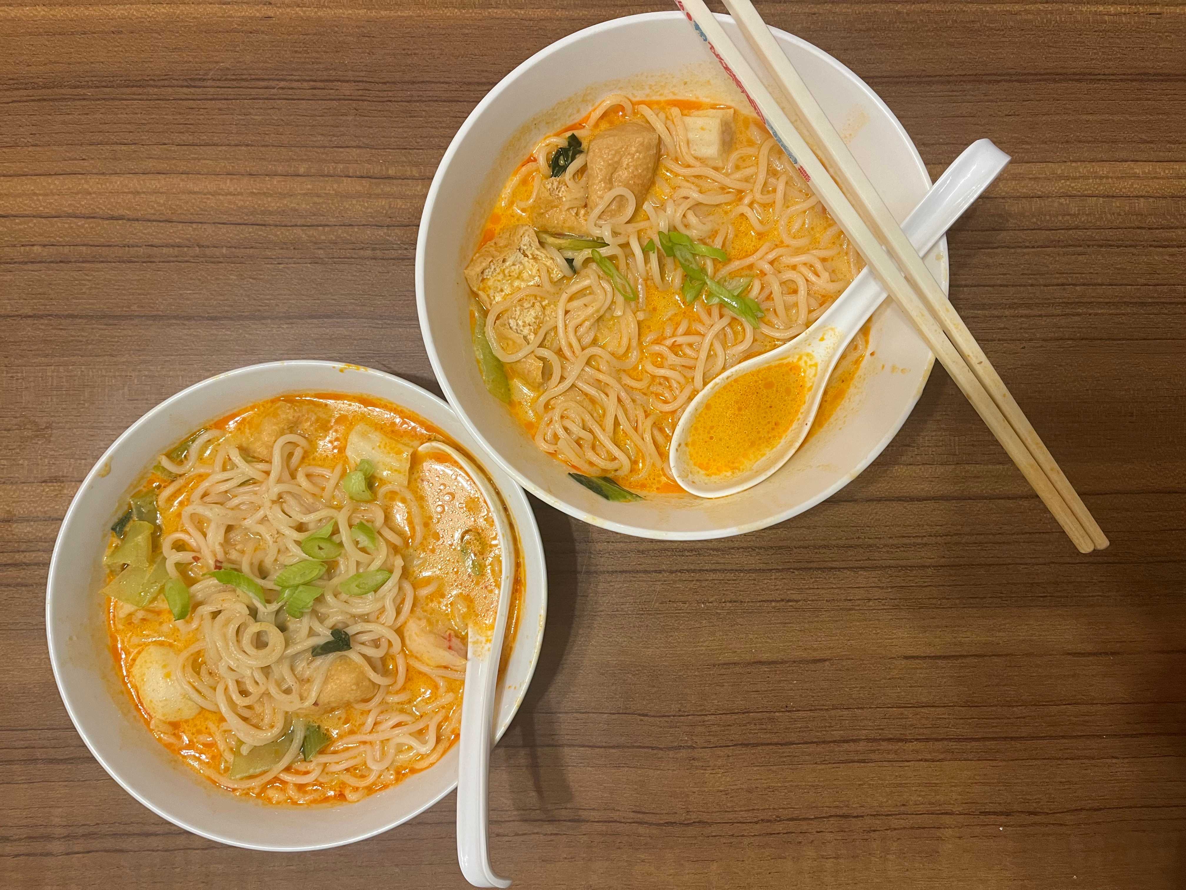 A rich and creamy coconut-based noodle soup inspired by the Singapore Katong style. Based on the "weekly noods" review images, this recipe features thick wheat noodles (La Mian) swimming in a savory, spicy broth, topped with bouncy fish balls, broth-soaked fried tofu puffs, tender bok choy, and fresh scallions (spronions). While the images feature the premium Prima Taste packet, this recipe outlines how to create the complete dish using either the kit or store-bought laksa paste.