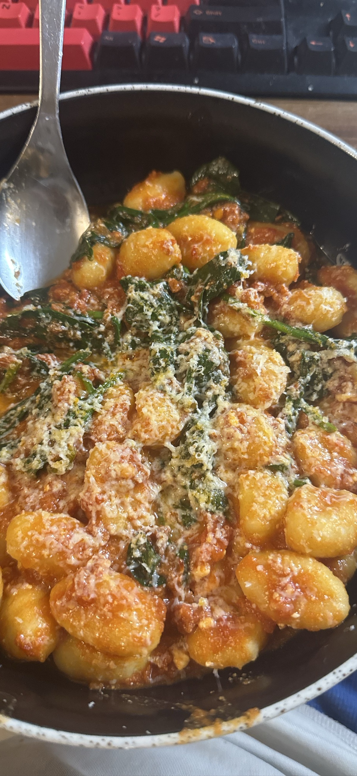 gnocchi with nduja, tomato, garlic, cottage cheese, spinach