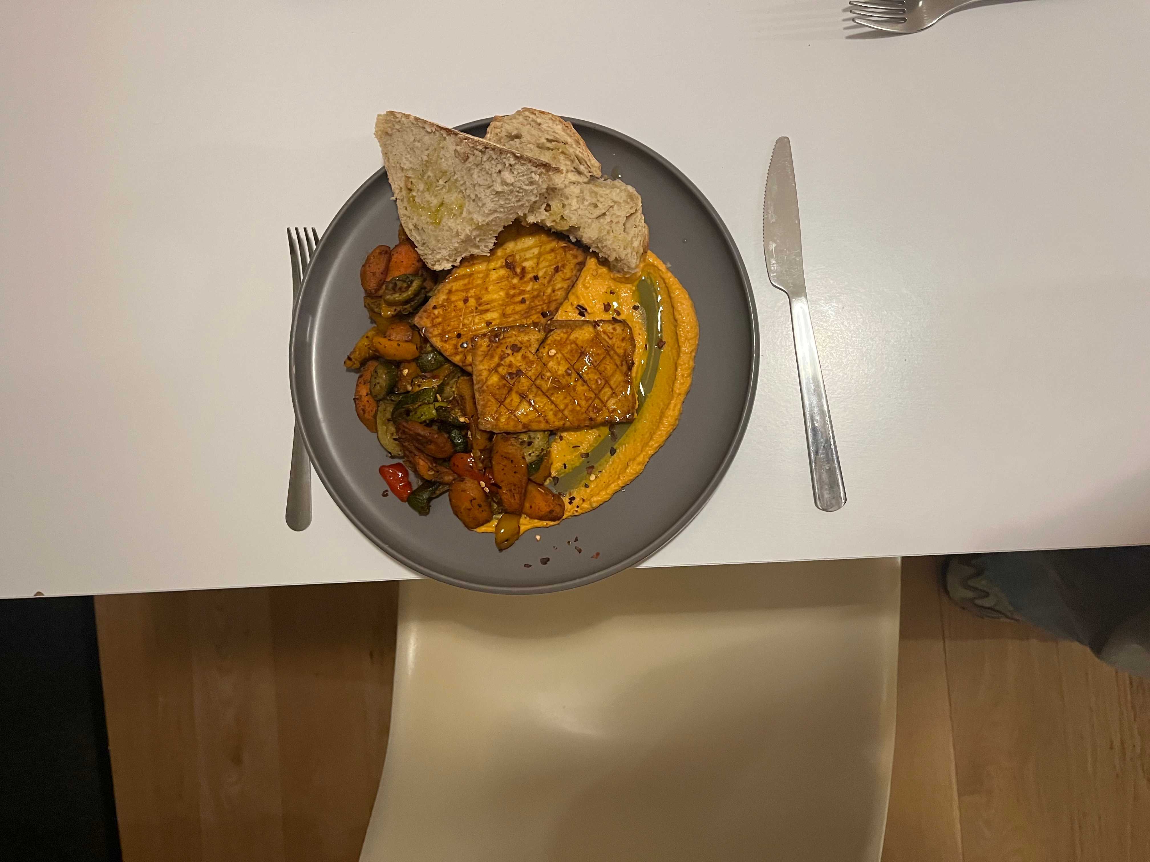 scored tofu steaks with roasted vegetables and red pepper hummus