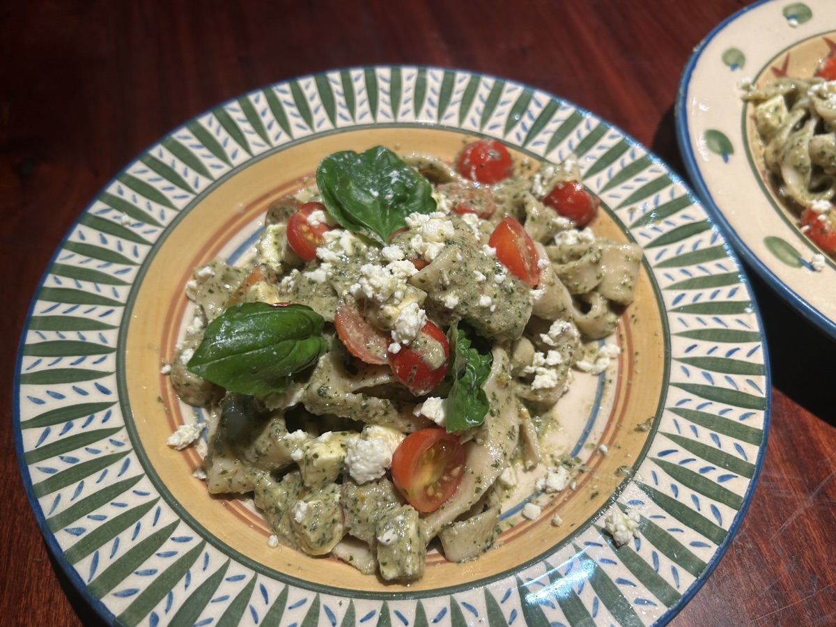 homemade pesto pasta and baba ganoush
