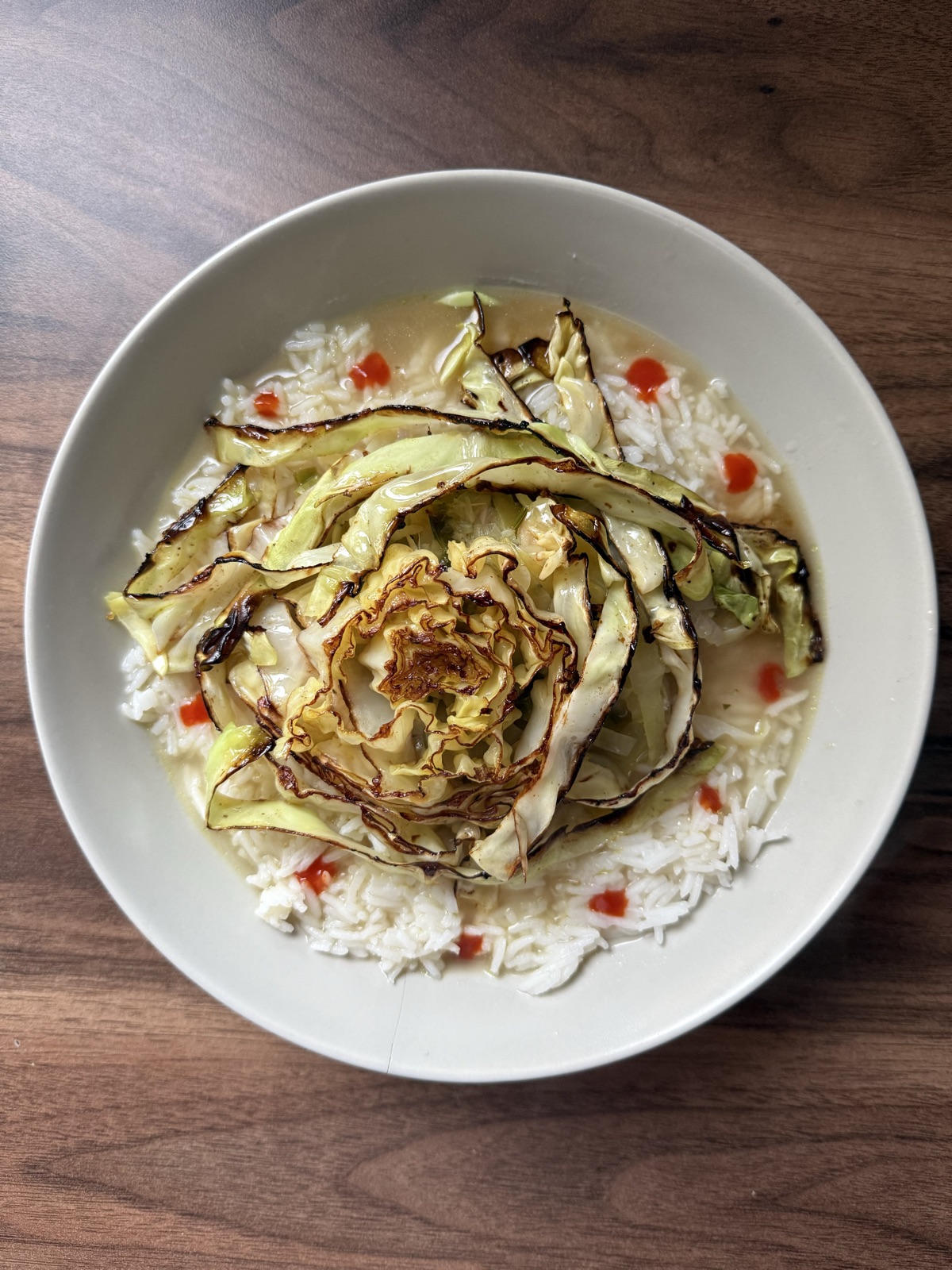 A quick ginger and chicken broth with spring onions, ginger, garlic, coriander served with rice and seared cabbage