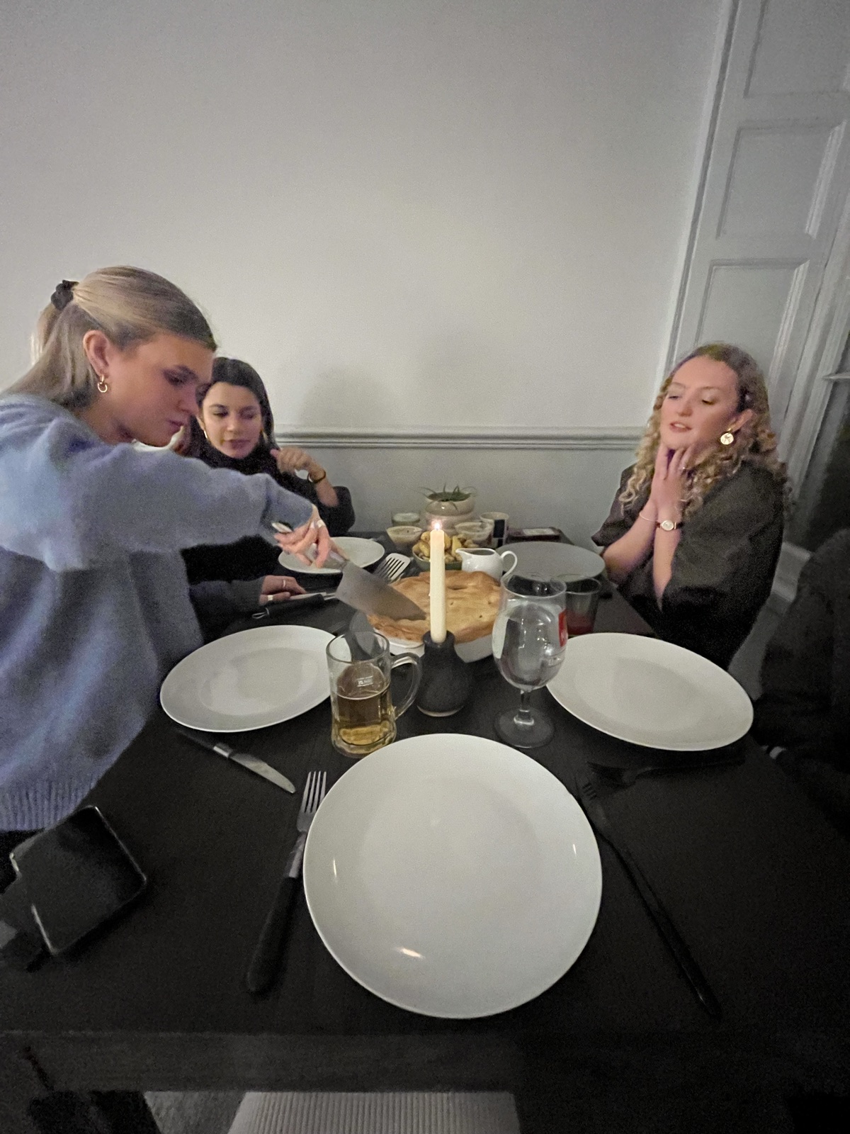 We finished our first 4 written exams! This pie was a nice end to a stressful week. Consists of chicken, leak, mushroom, with puff pastry top and a side of roast potato’s and gravy.