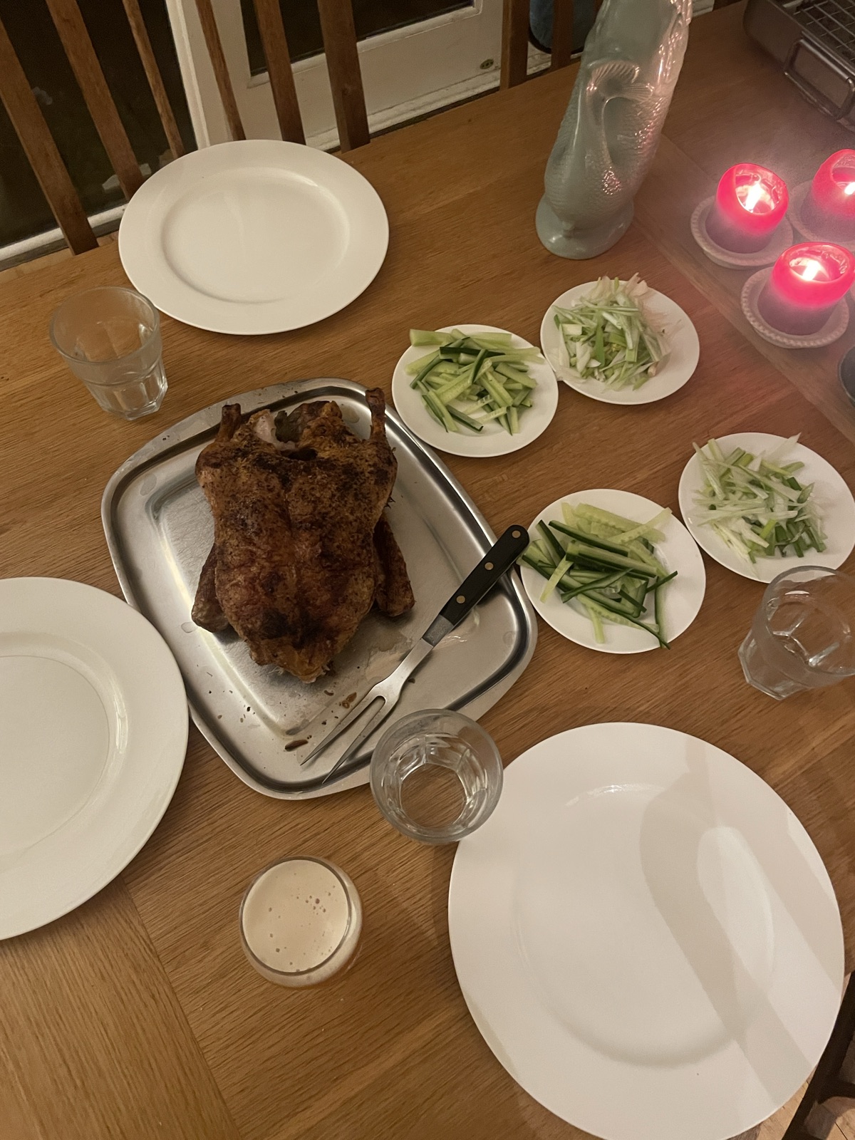 Salt and 5 spice up the duck, pancakes, cucumber, spring onions and plum sauce - god yeah