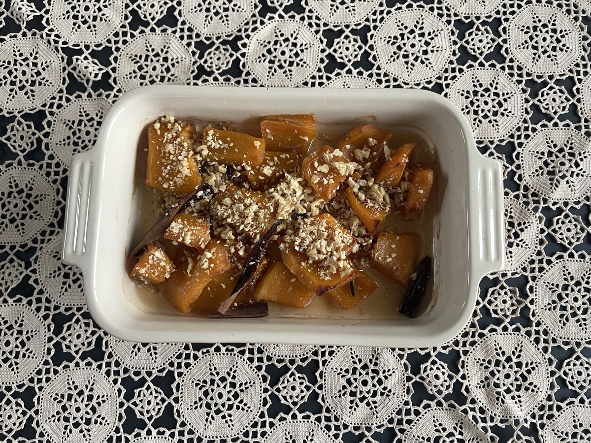 A classic Turkish dessert featuring tender chunks of pumpkin slow-cooked with sugar, cinnamon, and cloves until glossy and candied. This recipe finishes the dish in the oven for a rich, caramelized texture, topped with crunchy walnuts for the perfect contrast.