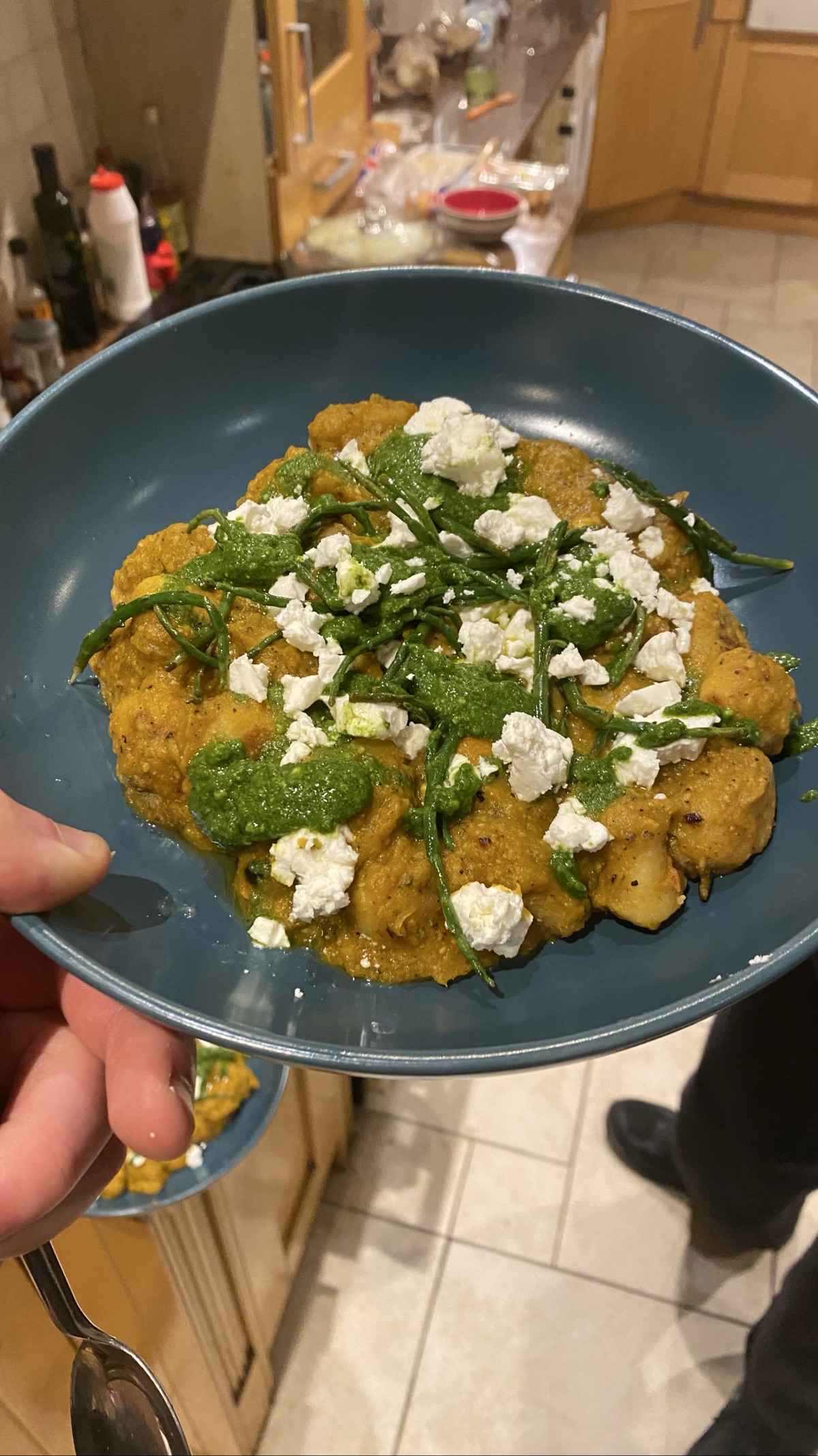 roasted butternut squash and cashew sauce, topped with feta, fried samphire and homemade zhoug. finished with hella burnt lemon