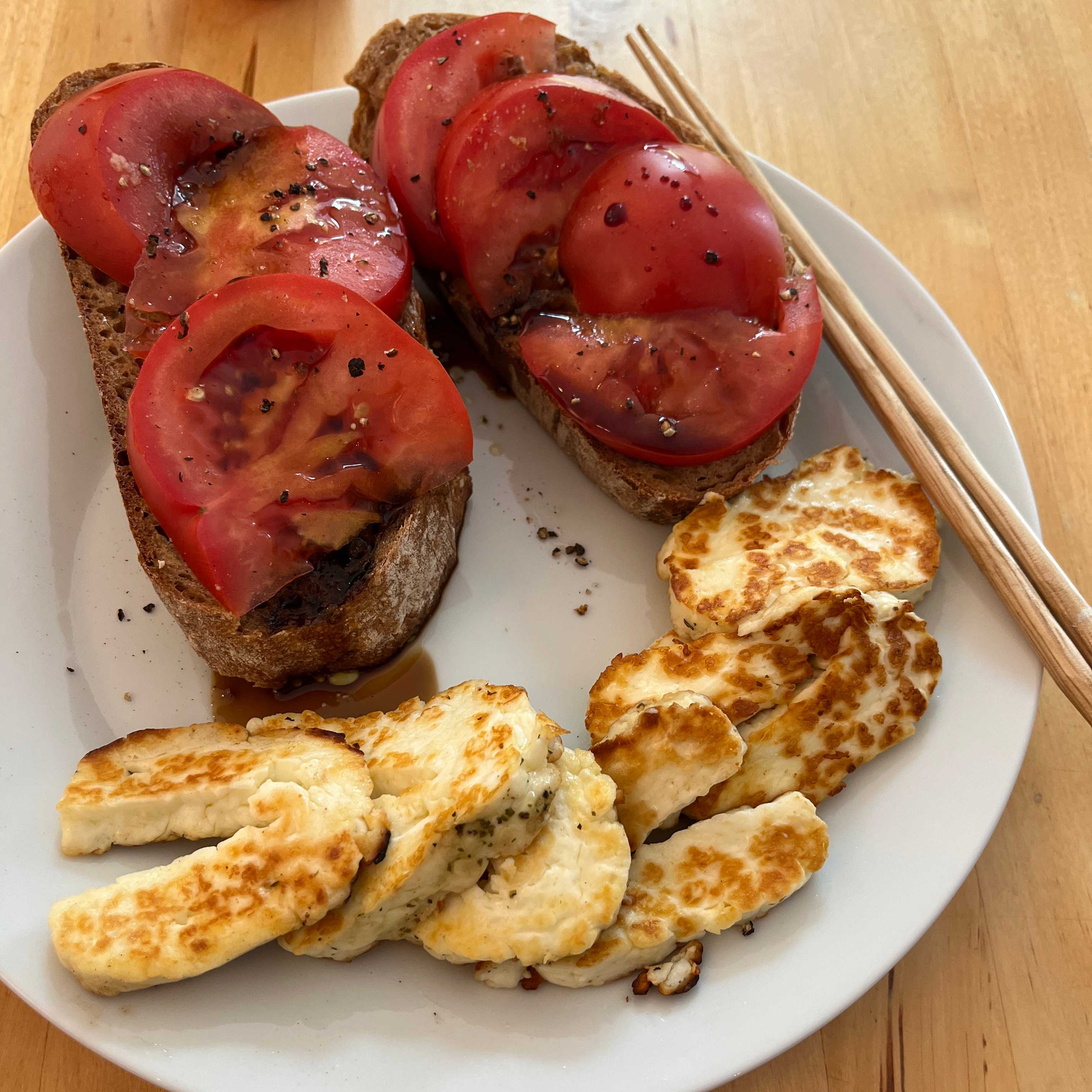 A hearty and savory lunch featuring golden, pan-seared halloumi cheese served alongside rustic sourdough toast topped with fresh tomato slices, cracked black pepper, and a rich balsamic glaze.