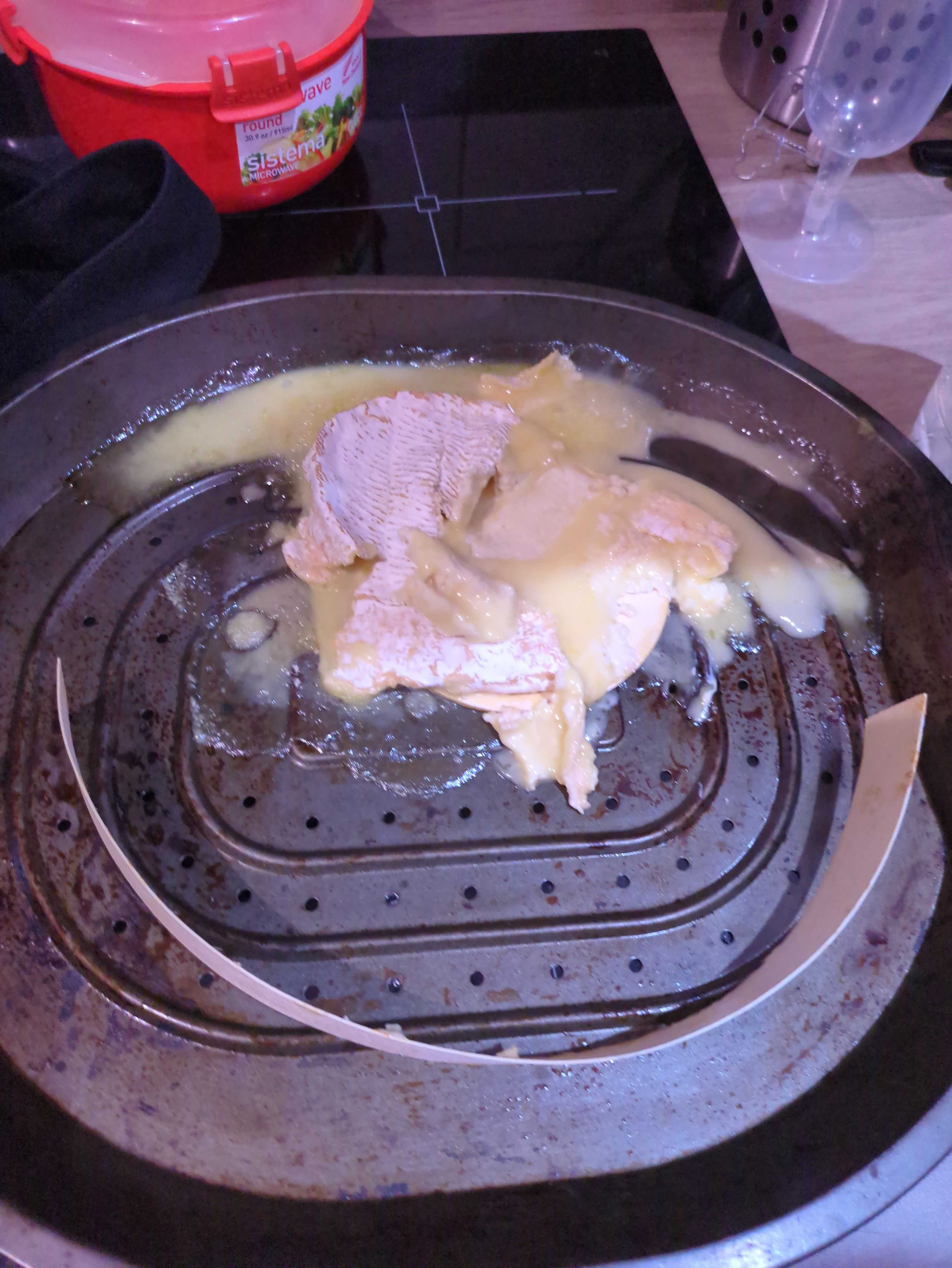 A classic French appetiser featuring a whole wheel of soft-ripened cheese baked until molten and gooey. While the image shows a free-form melt on a tray, this recipe recommends using a small baking dish or the wooden box to contain the rich, creamy cheese for the perfect dipping experience.
