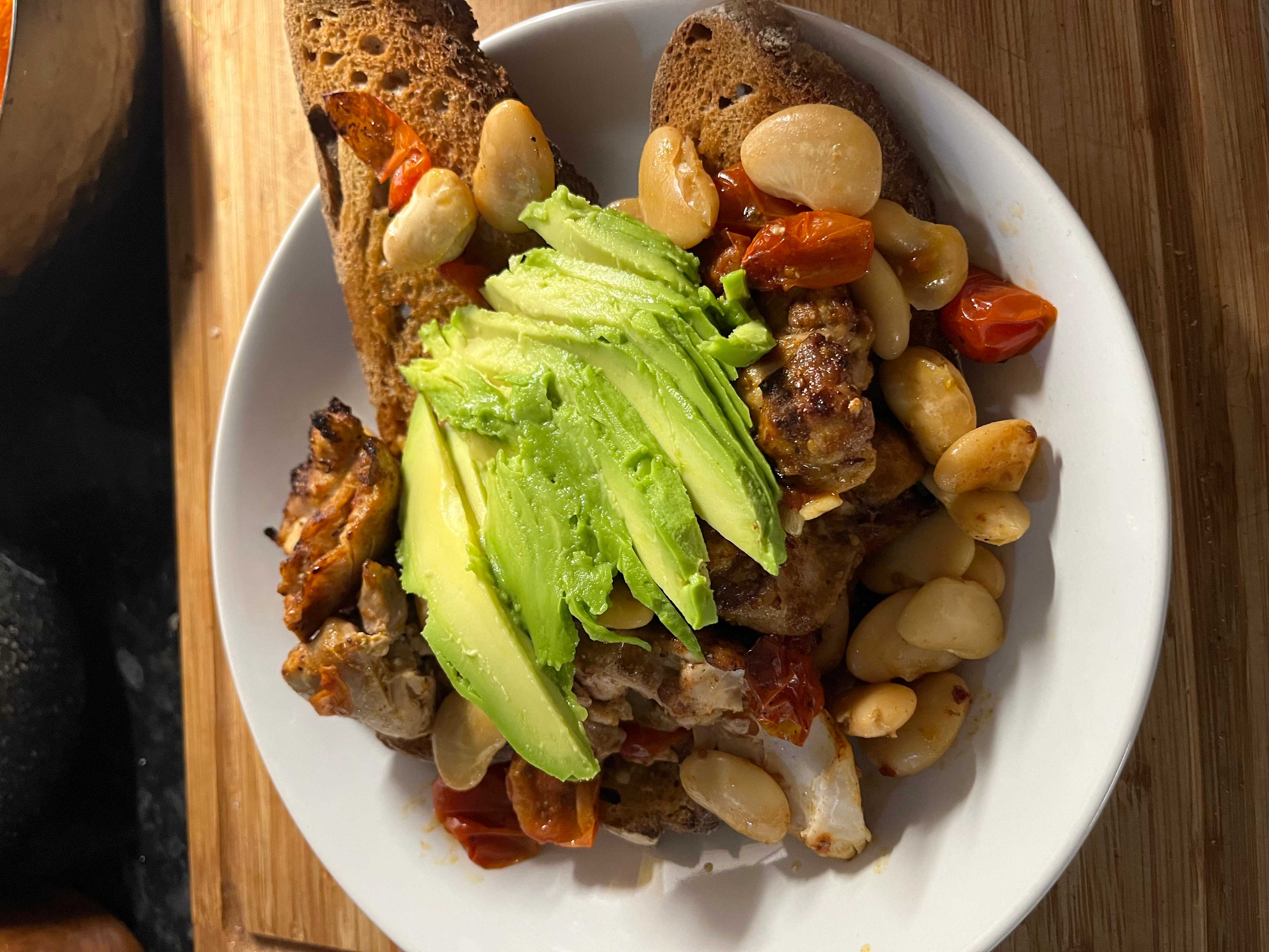 A hearty and nutritious open-faced sandwich perfect for a filling lunch or casual dinner. This dish features pan-seared chicken pieces tossed with creamy butter beans and burst cherry tomatoes, piled high on crusty sourdough toast and topped with fresh sliced avocado. The combination of warm, savory stewed beans and cool, creamy avocado makes for a delightful texture contrast.