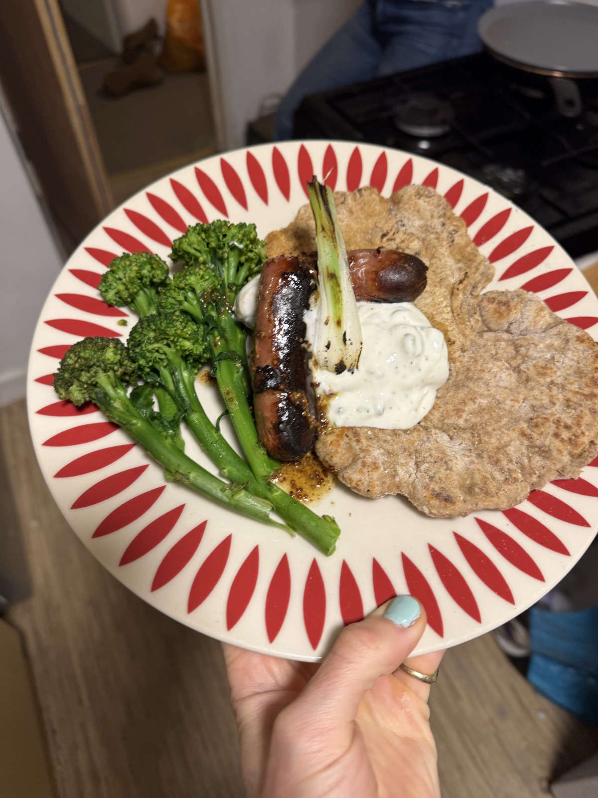 greek yogurt flatbreads, sausages, roasted spring onion, broccoli and herby yogurt