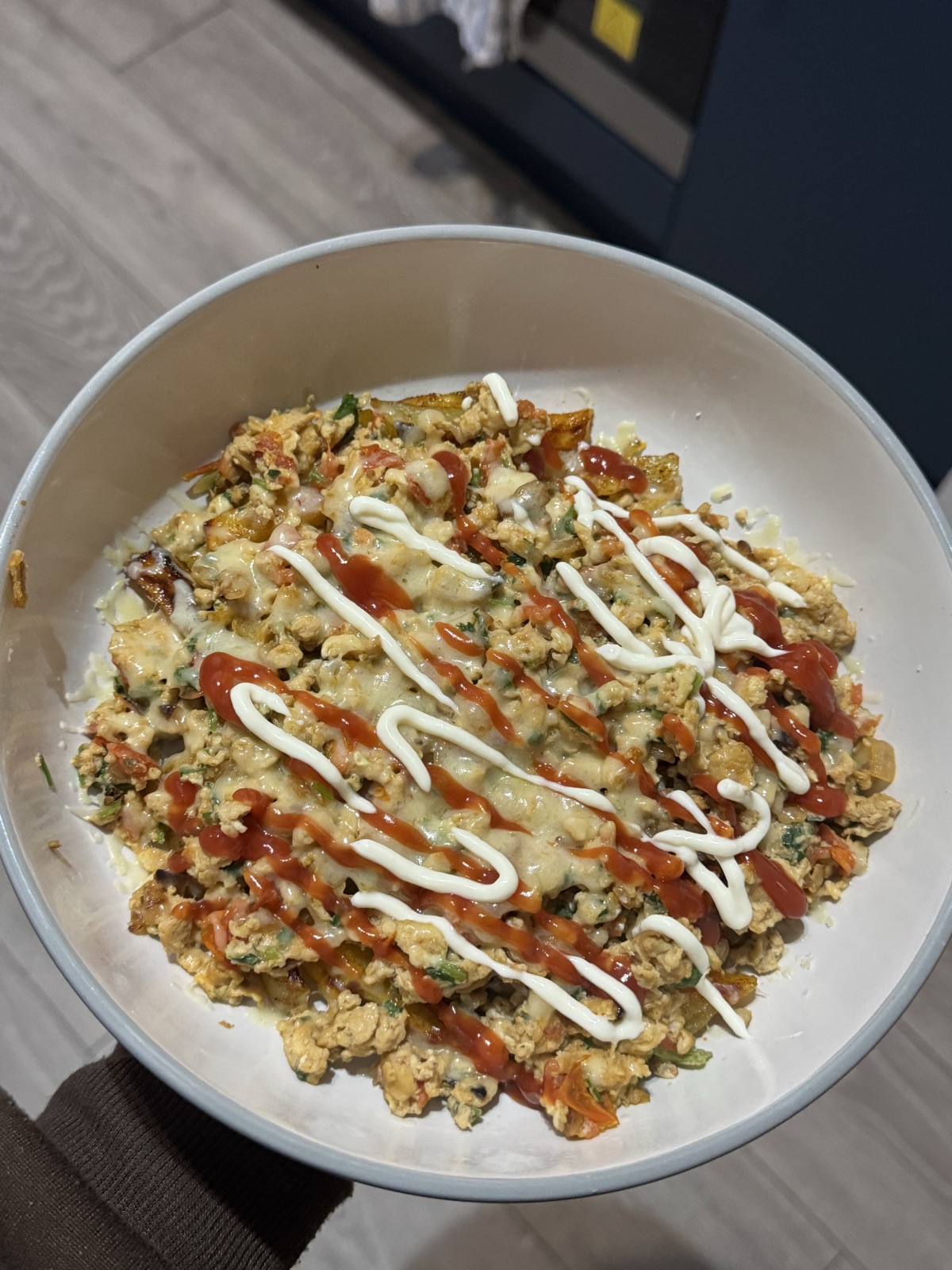 oven-baked fries topped with scrambled eggs cooked with tomatoes and corriander. Top with melted cheese