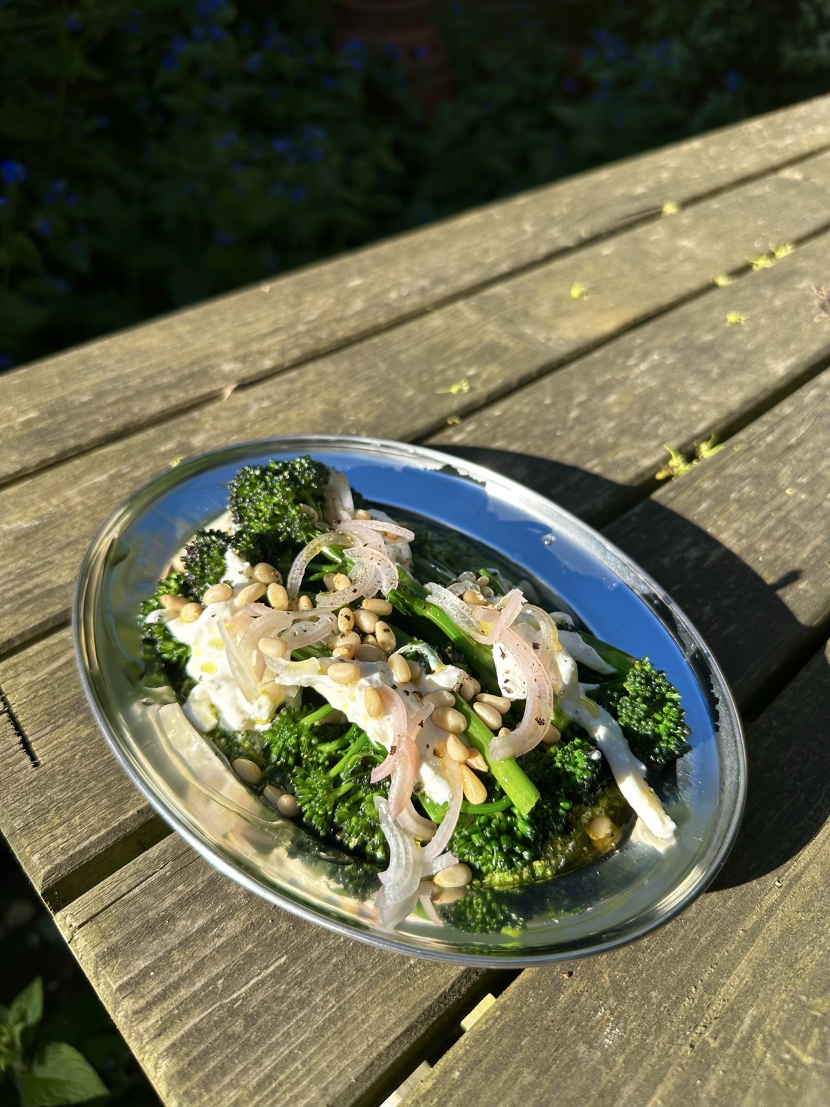 purple sprouting broccoli, wild card pesto, pickled shallots and burrata