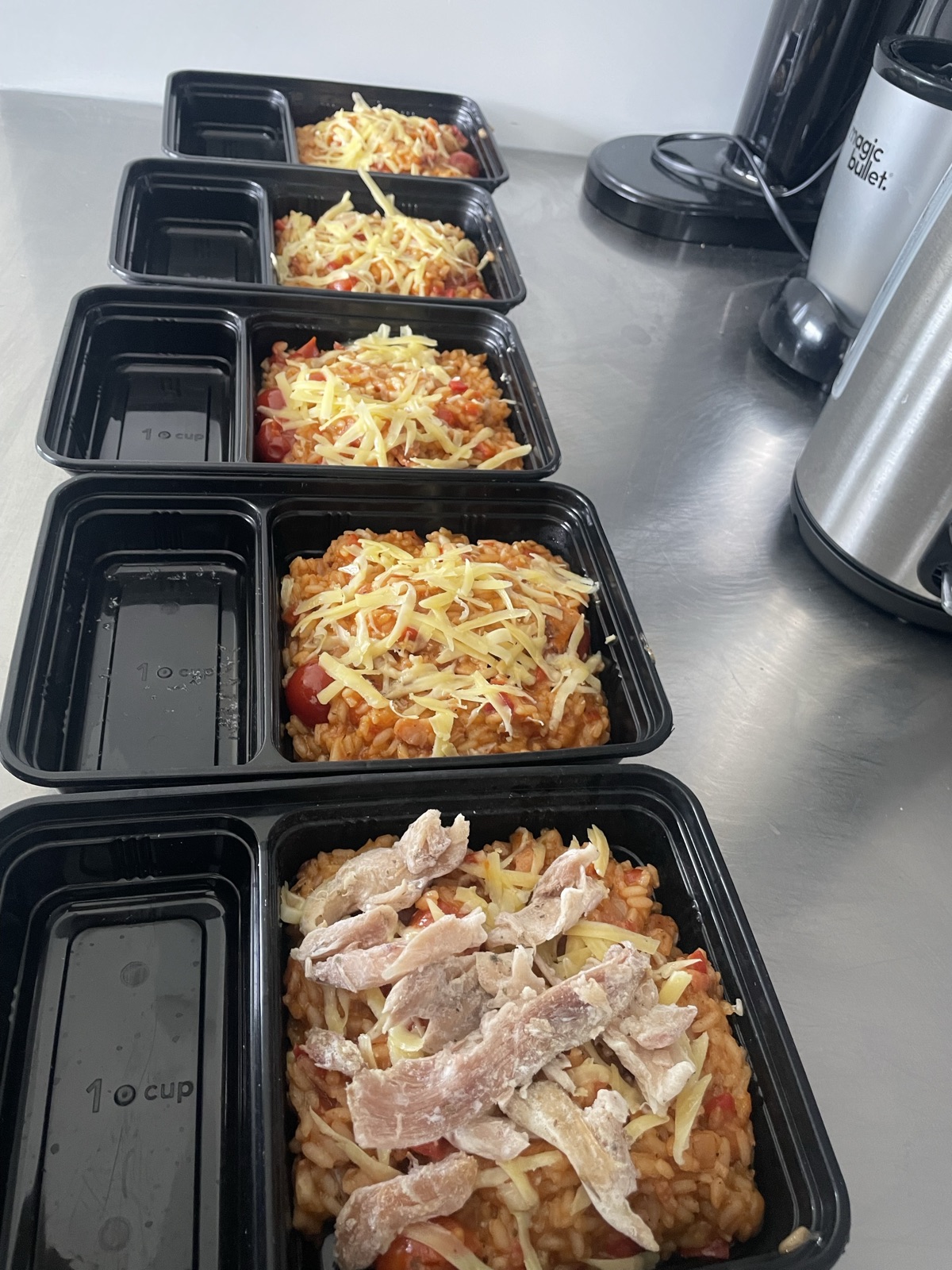 Smokey bacon, roasted red pepper, cherry tomato risotto with cheese, leftover roast chicken and salad