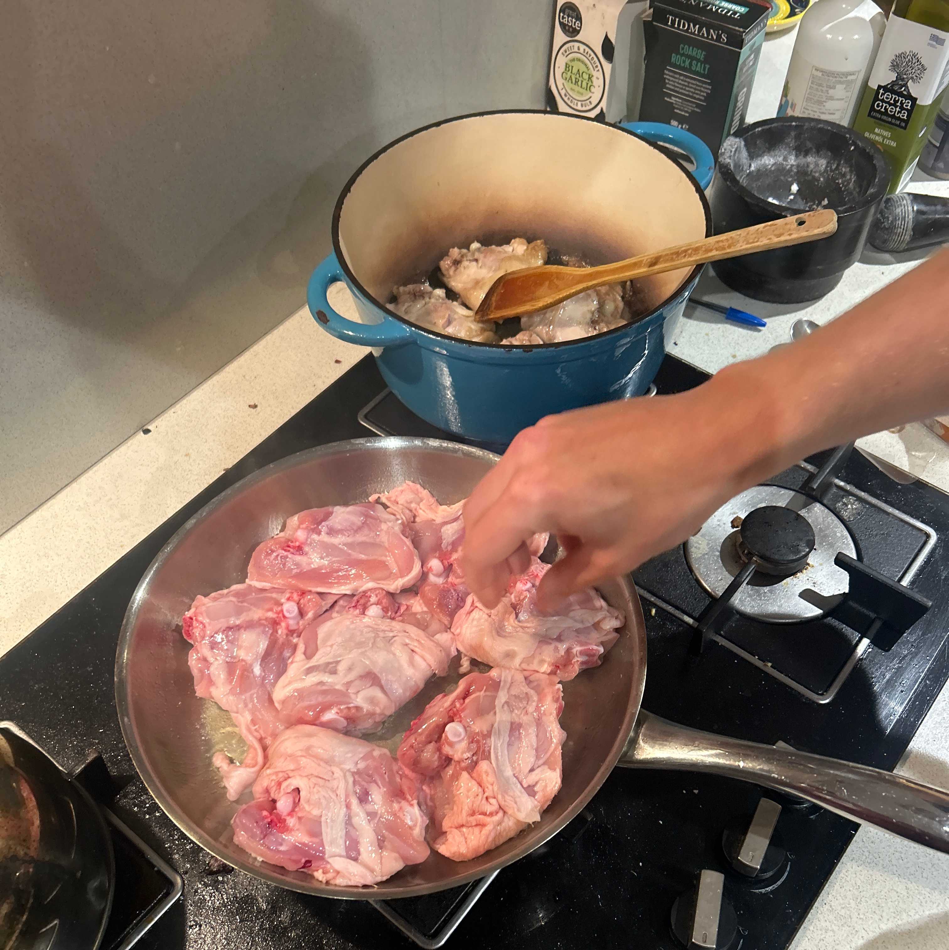 A deep, savory, and umami-rich dish featuring tender chicken thighs browned to perfection and braised in a sauce infused with sweet black garlic. Inspired by the ingredients visible in your kitchen, specifically the black garlic bulb and premium olive oil, this recipe transforms simple pantry staples into a gourmet meal.