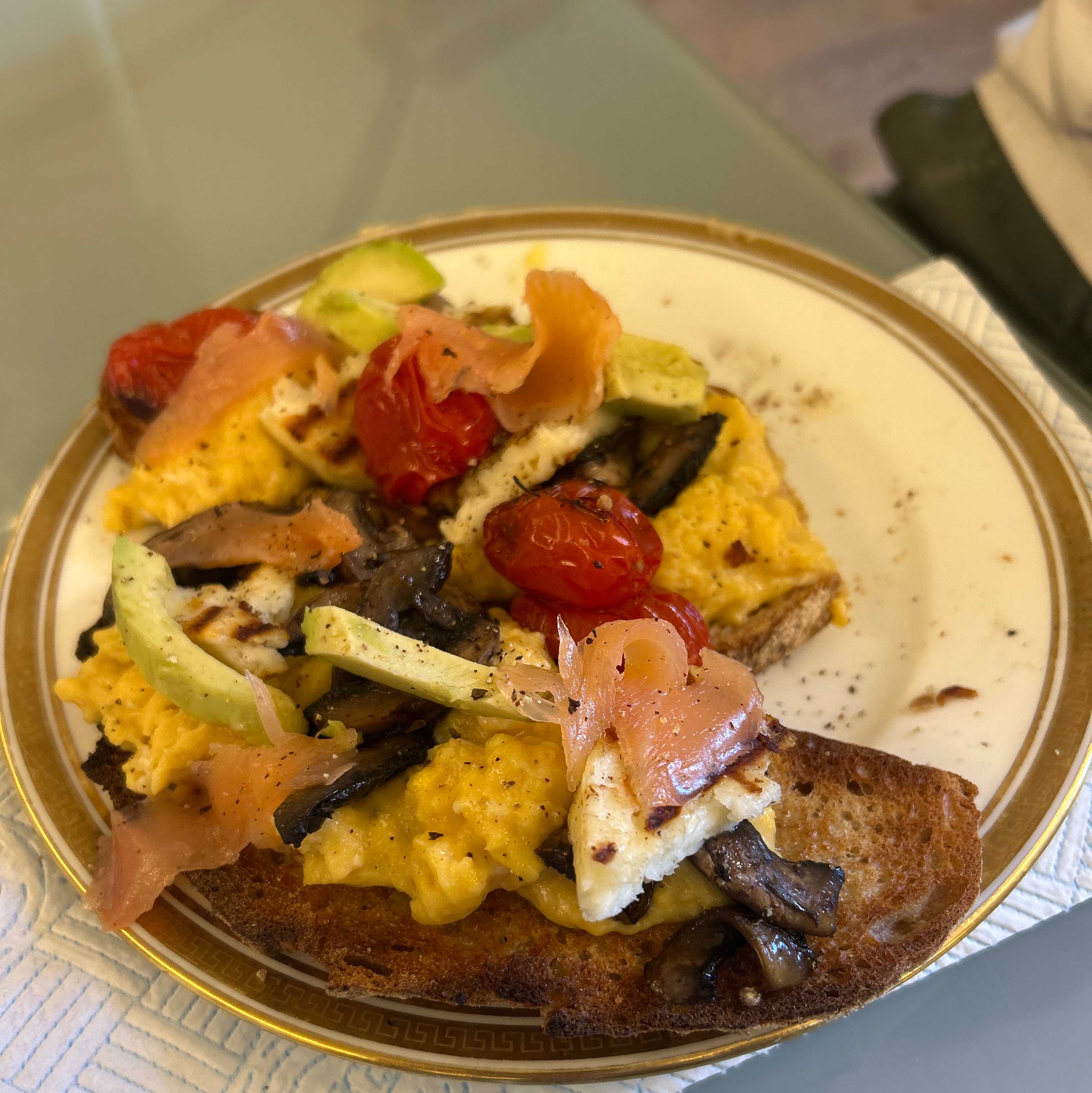 ← all recipesloaded scrambled egg toast with halloumi & smoked salmon