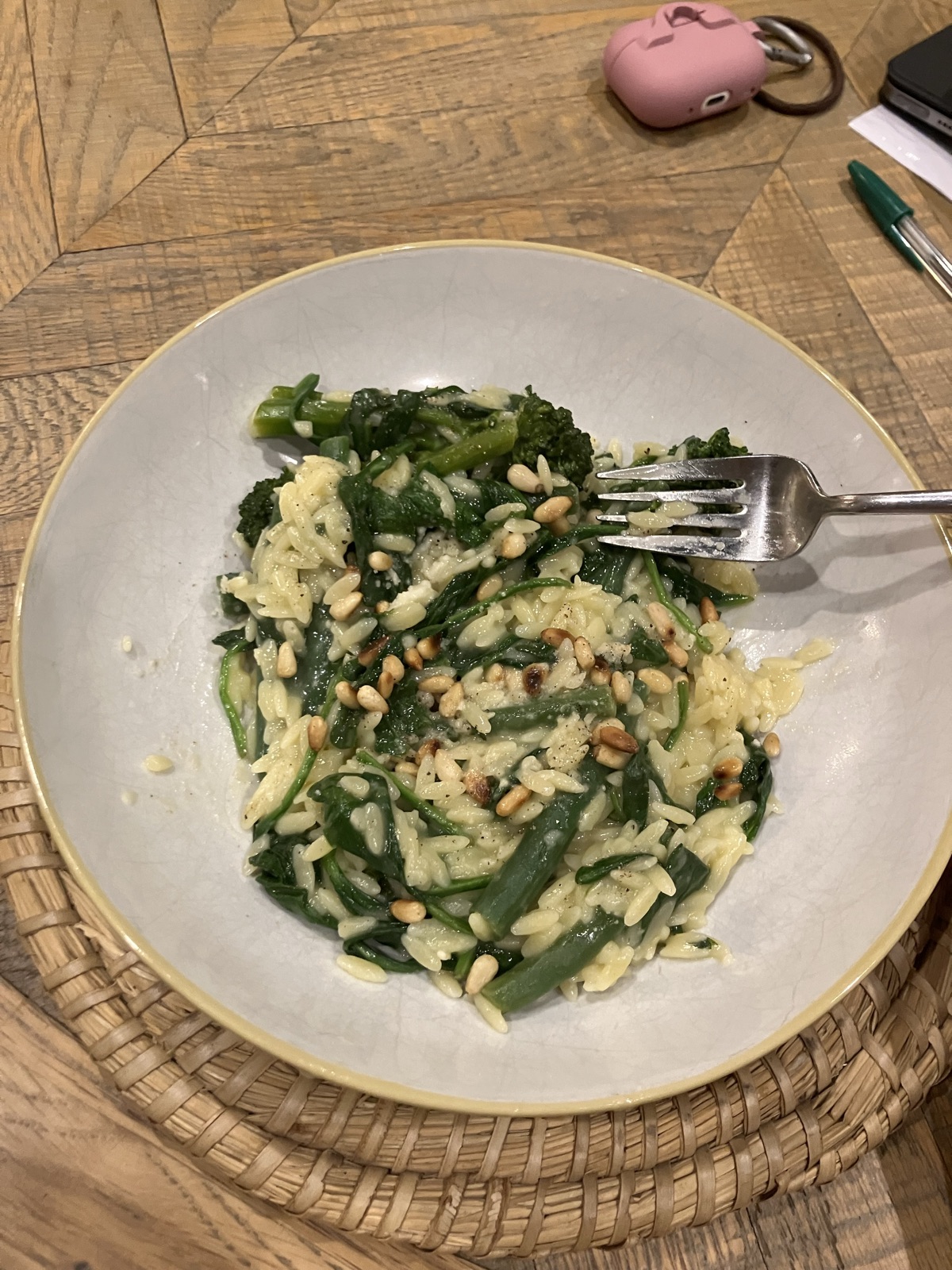 With spinach, green beans, broccoli and pine nuts - and plenty of garlic All in one pan with veggie stock!