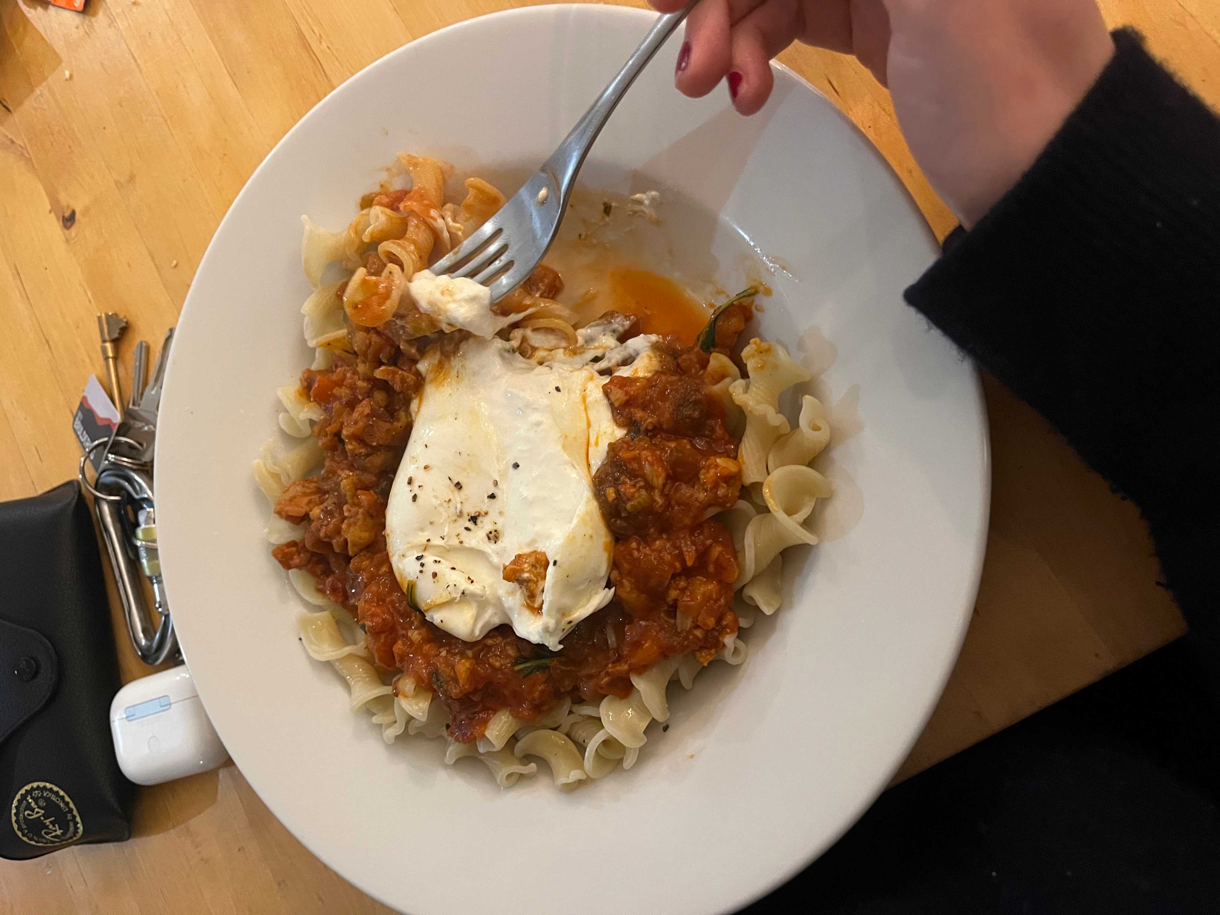 sausage, roasted garlic & aubergine ragu with burrata