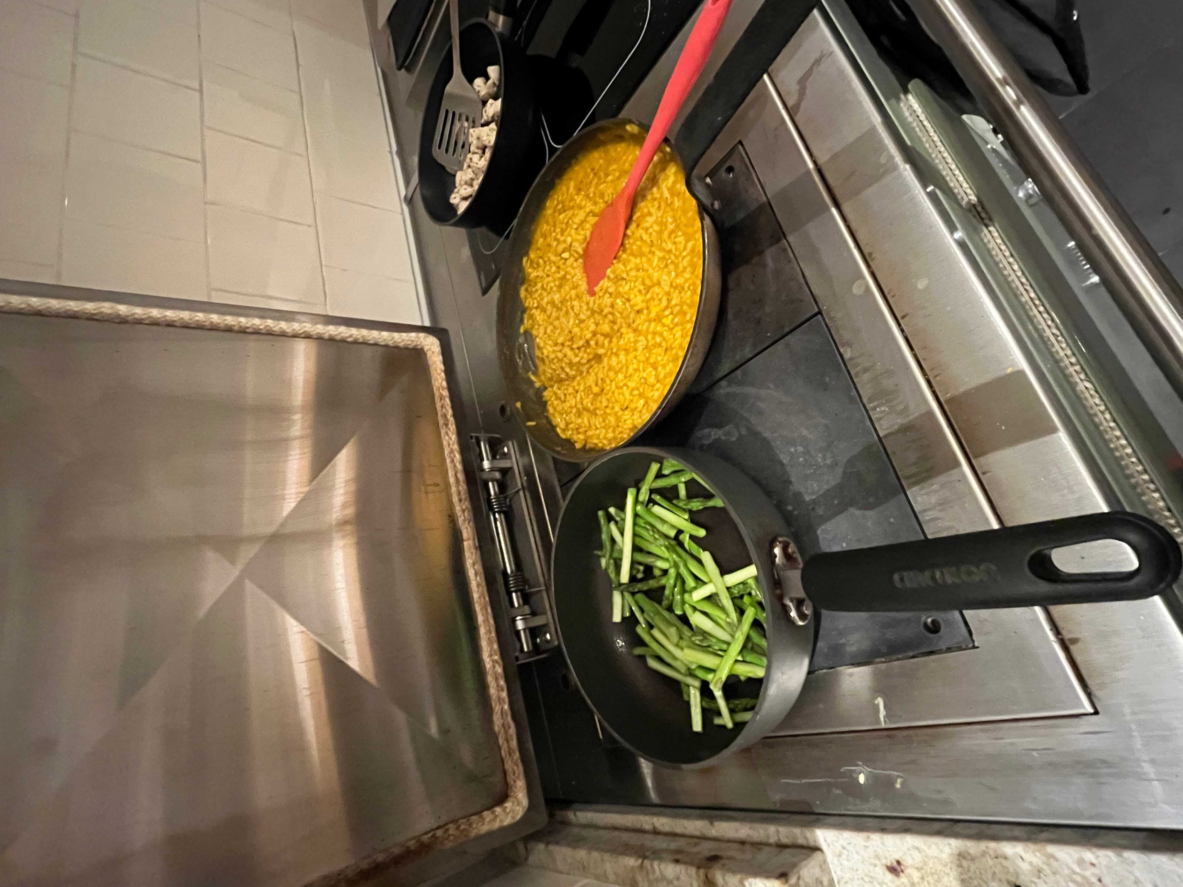 creamy pumpkin and saffron risotto with pan-seared asparagus