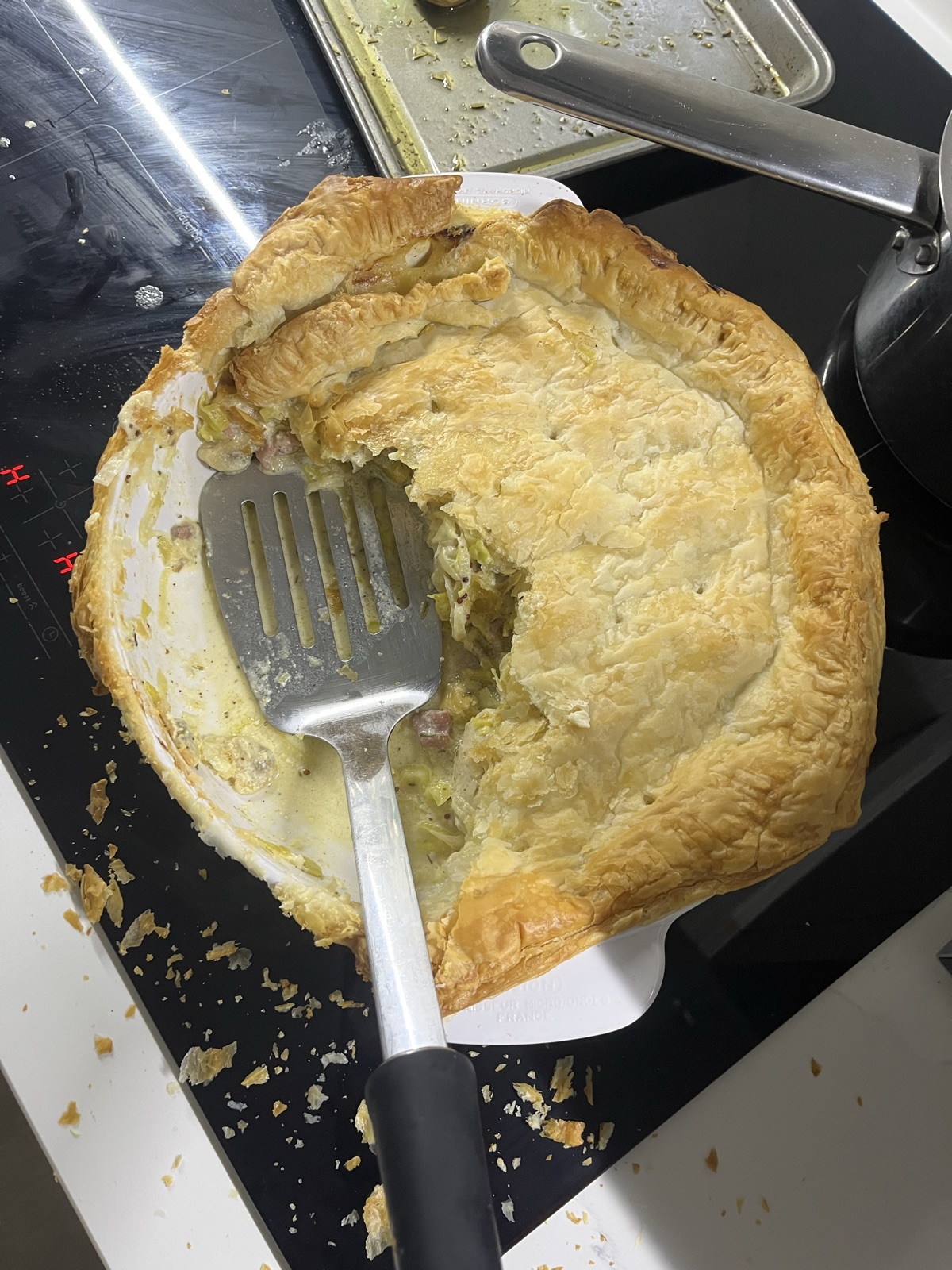chicken, pancetta , leak and mushroom short crust pie with baby potatos and broccoli