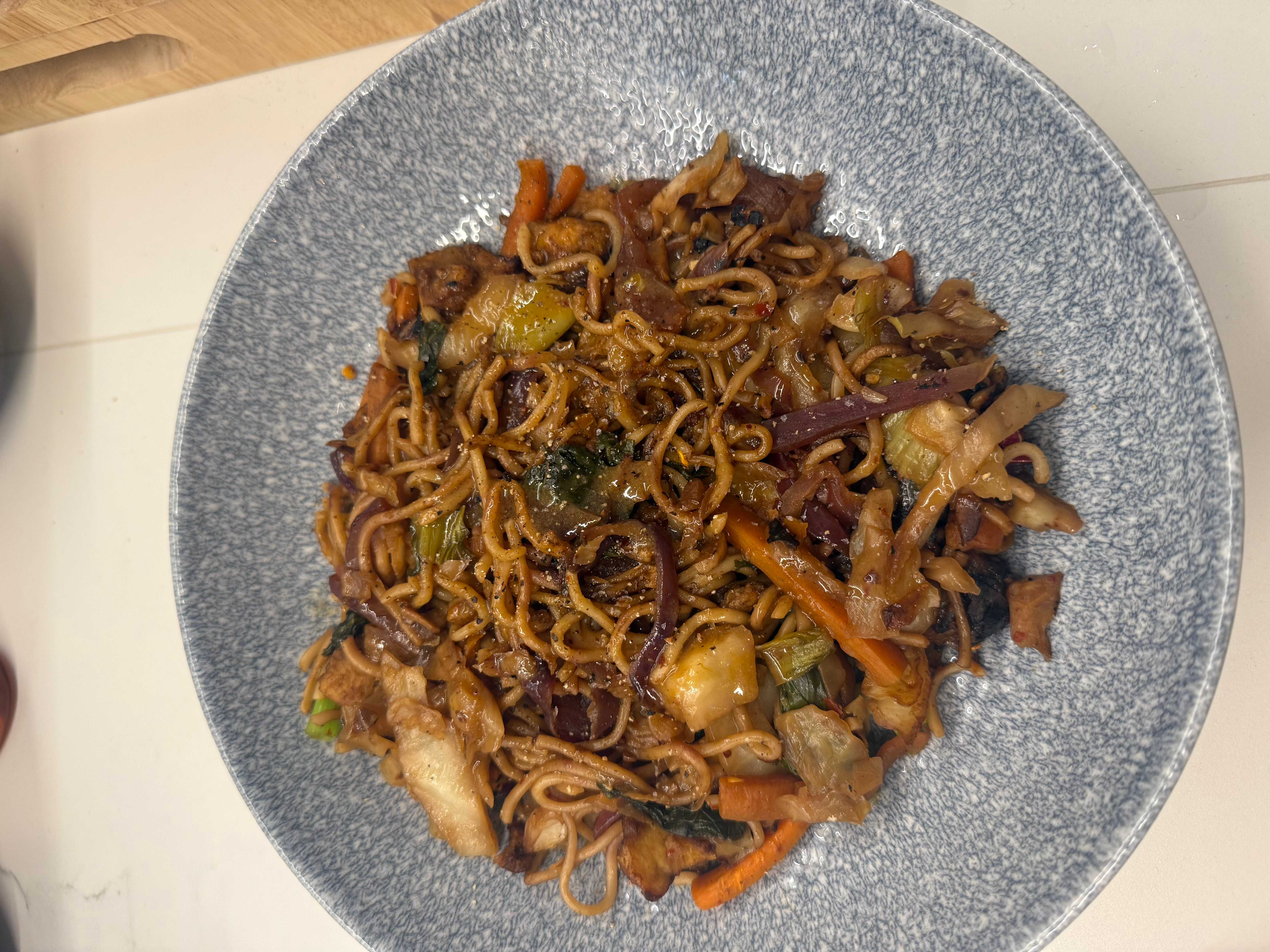 A comforting and flavor-packed bowl of stir-fried noodles loaded with crunchy vegetables like carrots, red onions, and cabbage. Tossed in a rich savory sauce made from soy and sesame oil, this dish is perfect for a quick weeknight dinner that rivals your favorite takeout.