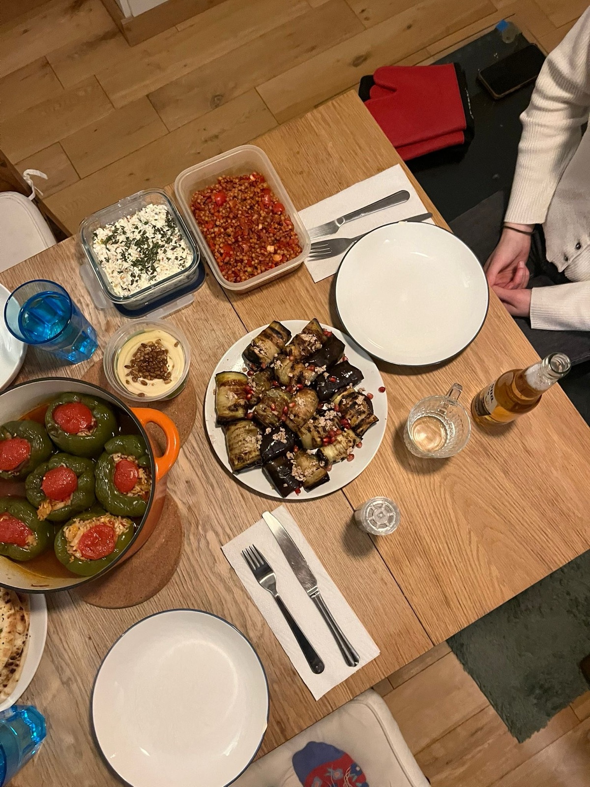Stuffed peppers, @mother’s aubergine roll recipe and carrot salad + other dish contributions from the gals