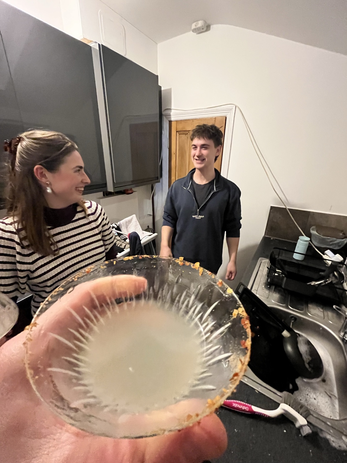 A fiery twist on the classic cocktail, captured perfectly in this candid kitchen moment. This spicy margarita features a zesty lime base, smooth tequila, and a kick of heat, finished with a signature chili-salt rim.
