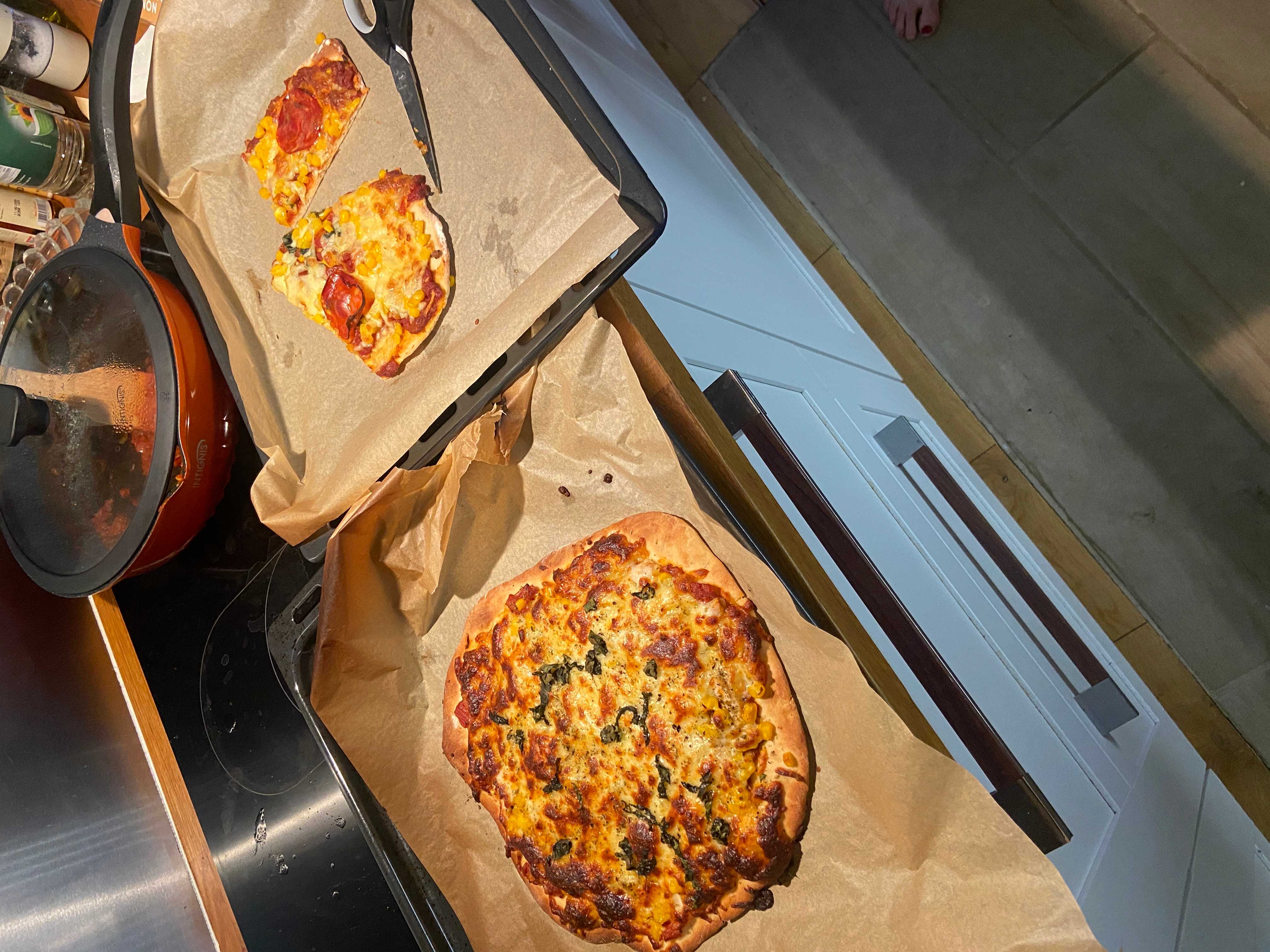 A comforting, homemade pizza recipe that embodies 'the idea of happiness'. Featuring a hearty, slightly dense crust topped with savory tomato sauce, bubbling golden cheese, sweet corn kernels, and crispy pepperoni. The result is a satisfying, unpretentious dinner perfect for sharing.