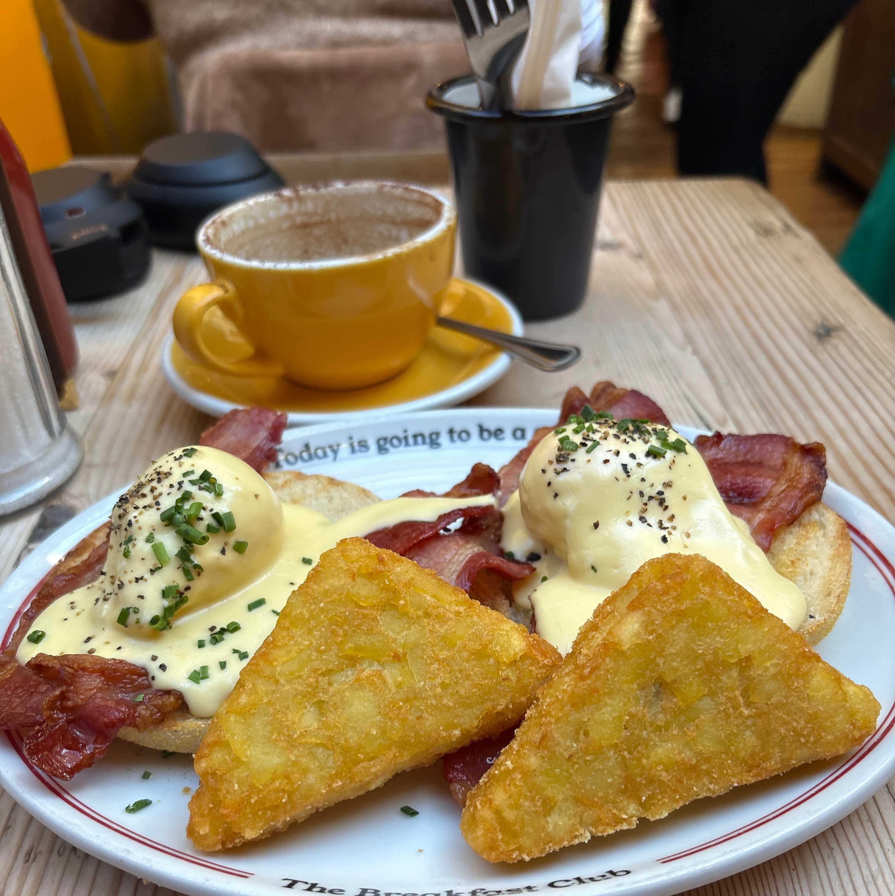 A quintessential diner-style brunch featuring toasted English muffins topped with crispy streaky bacon, perfectly poached eggs, and a rich, creamy homemade hollandaise sauce. Finished with fresh chives and cracked black pepper, and served alongside golden, crispy potato hash brown triangles.