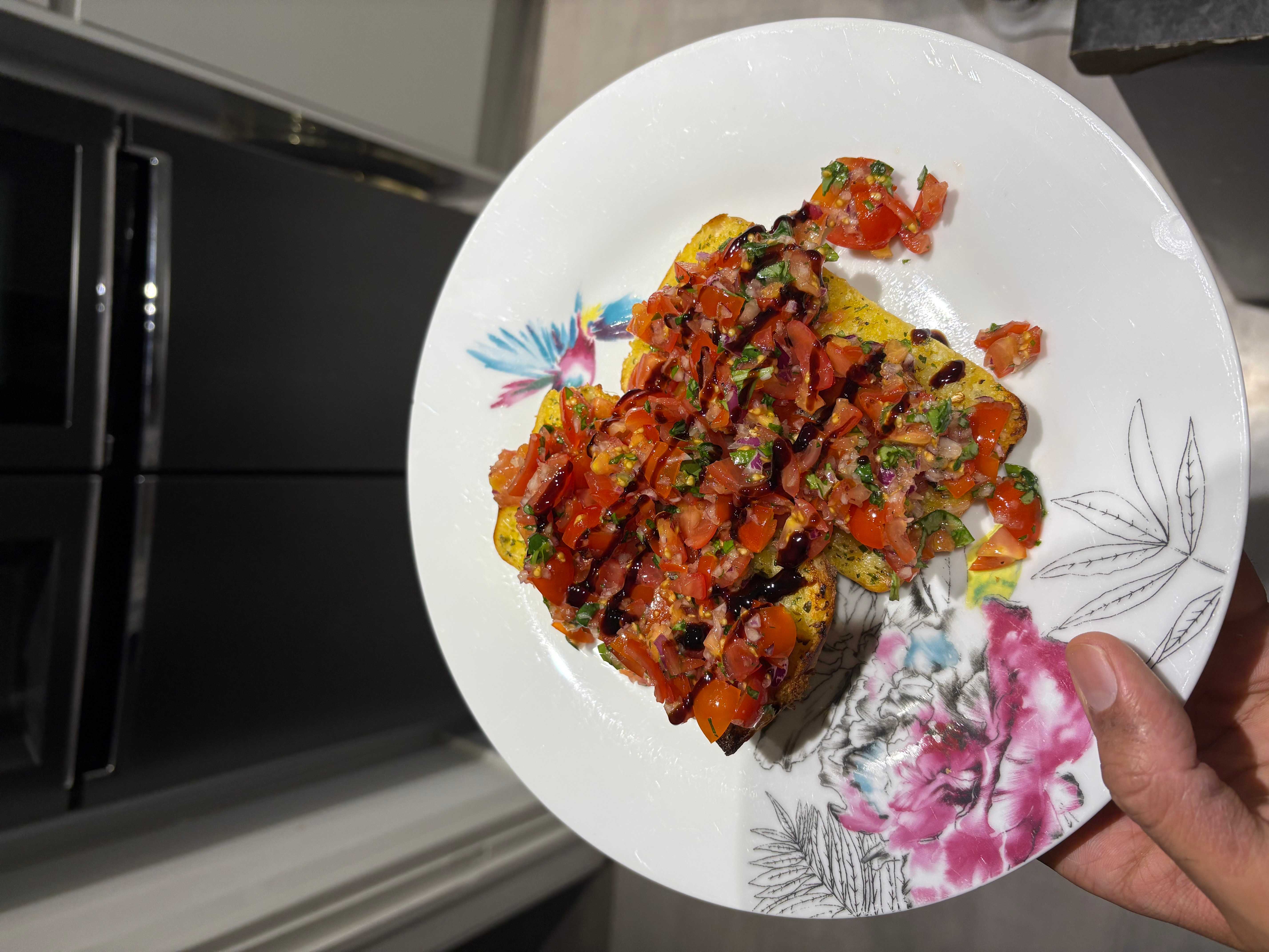 A flavorful fusion of two Italian favorites, combining the crunch of savory garlic bread with the fresh zest of classic bruschetta. This recipe uses non-dairy butter for a vegan-friendly version, featuring toasted bread topped with a vibrant mix of tomatoes, red onions, and basil, finished with a tangy balsamic glaze.