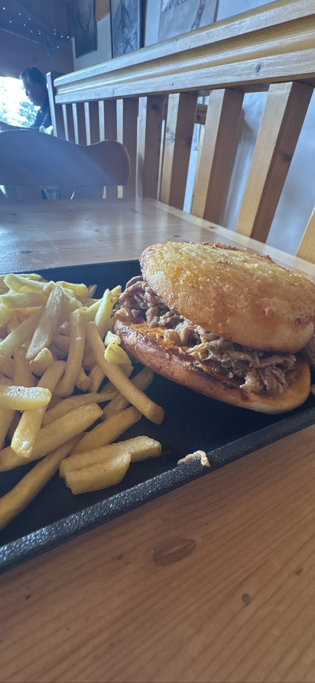 Tender, slow-cooked pork shoulder shredded and tossed in a tangy barbecue sauce, piled high on a toasted sturdy bun. Served alongside golden, crispy hand-cut french fries for the ultimate comfort meal.