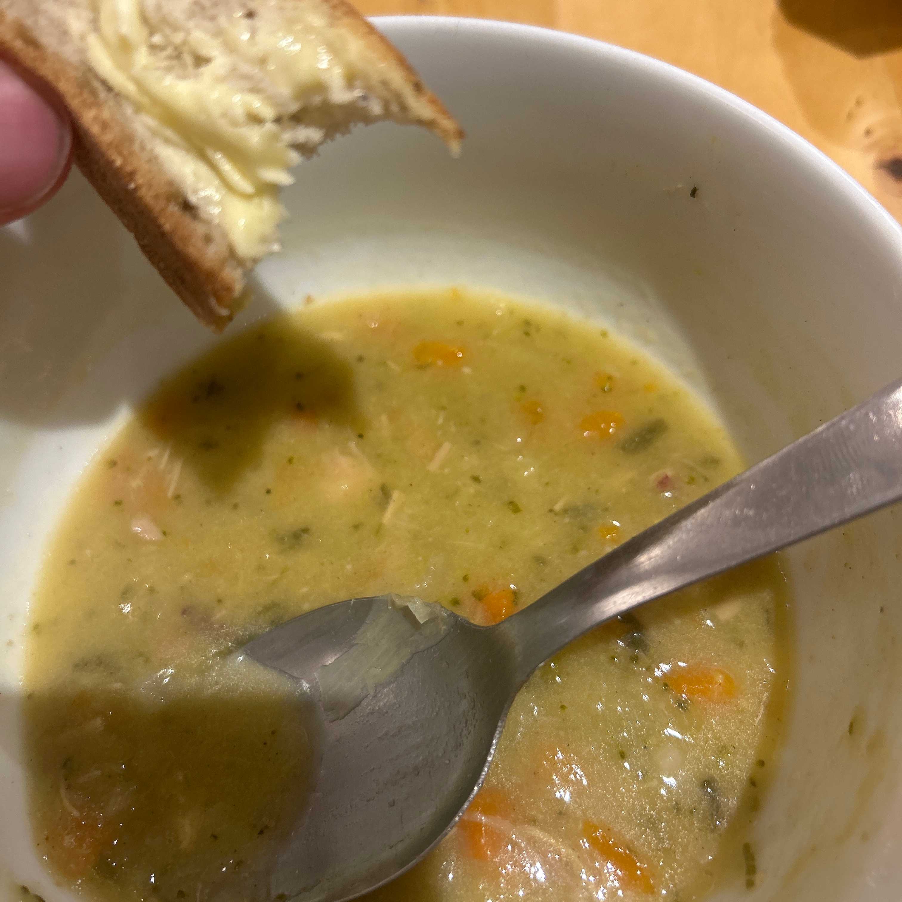 homestyle chicken and vegetable soup with buttered bread