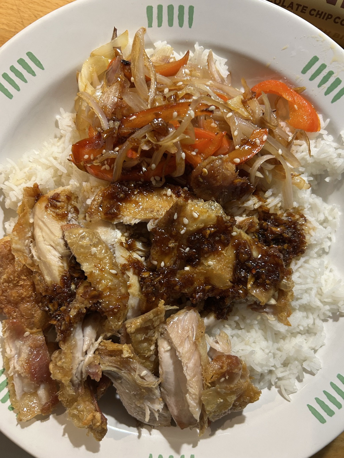 A honey, soy and garlic Chinese style sauce, over baked chicken thighs (skin on-bone removed) and some white rice. Alongside some stir fried shallots and peppers (everyone else got to the veg before me…)