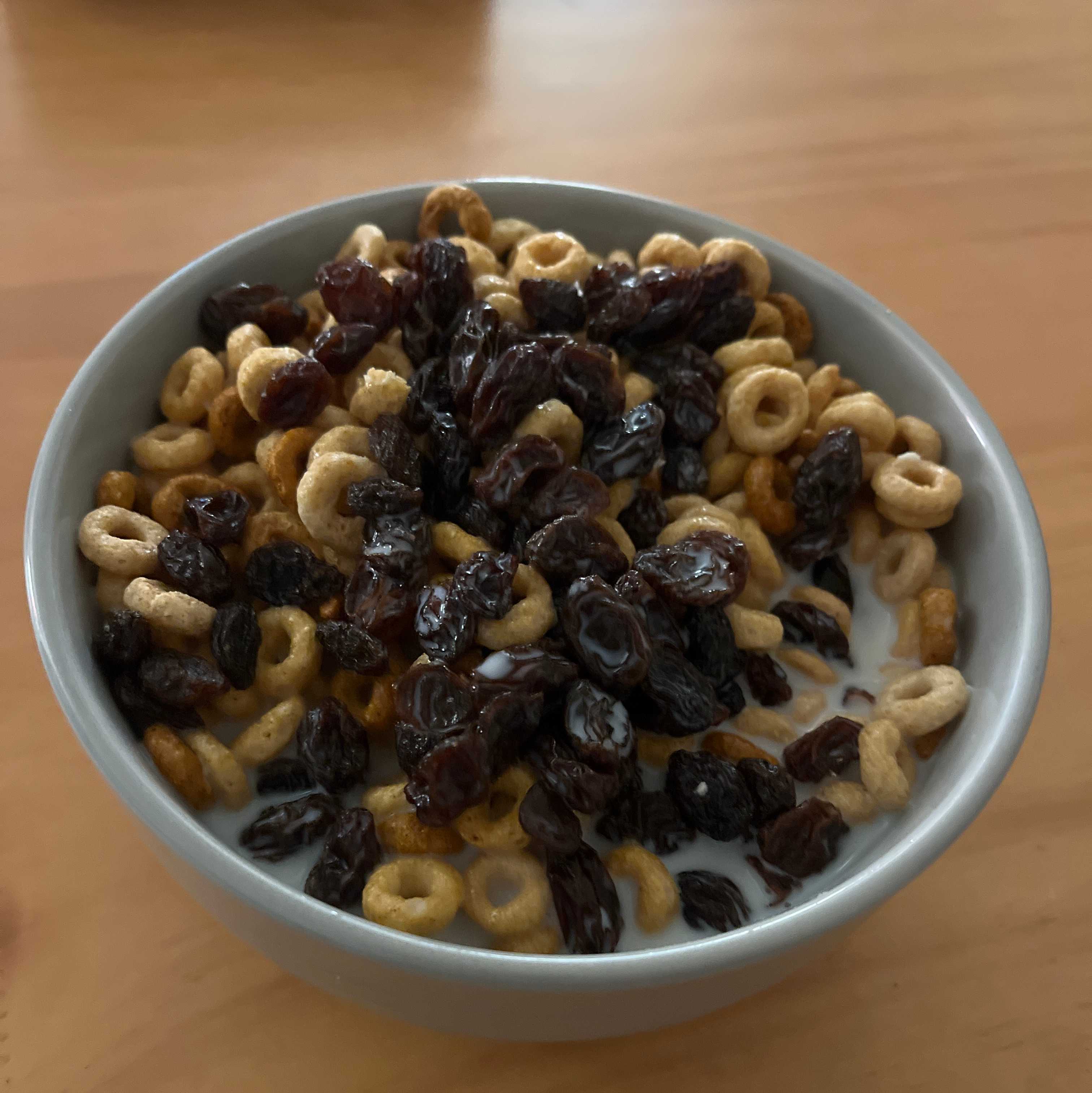 A classic American breakfast staple combining toasted oat cereal rings with cold milk and a generous topping of sweet raisins. This simple meal provides essential nutrients for a quick start to the day.