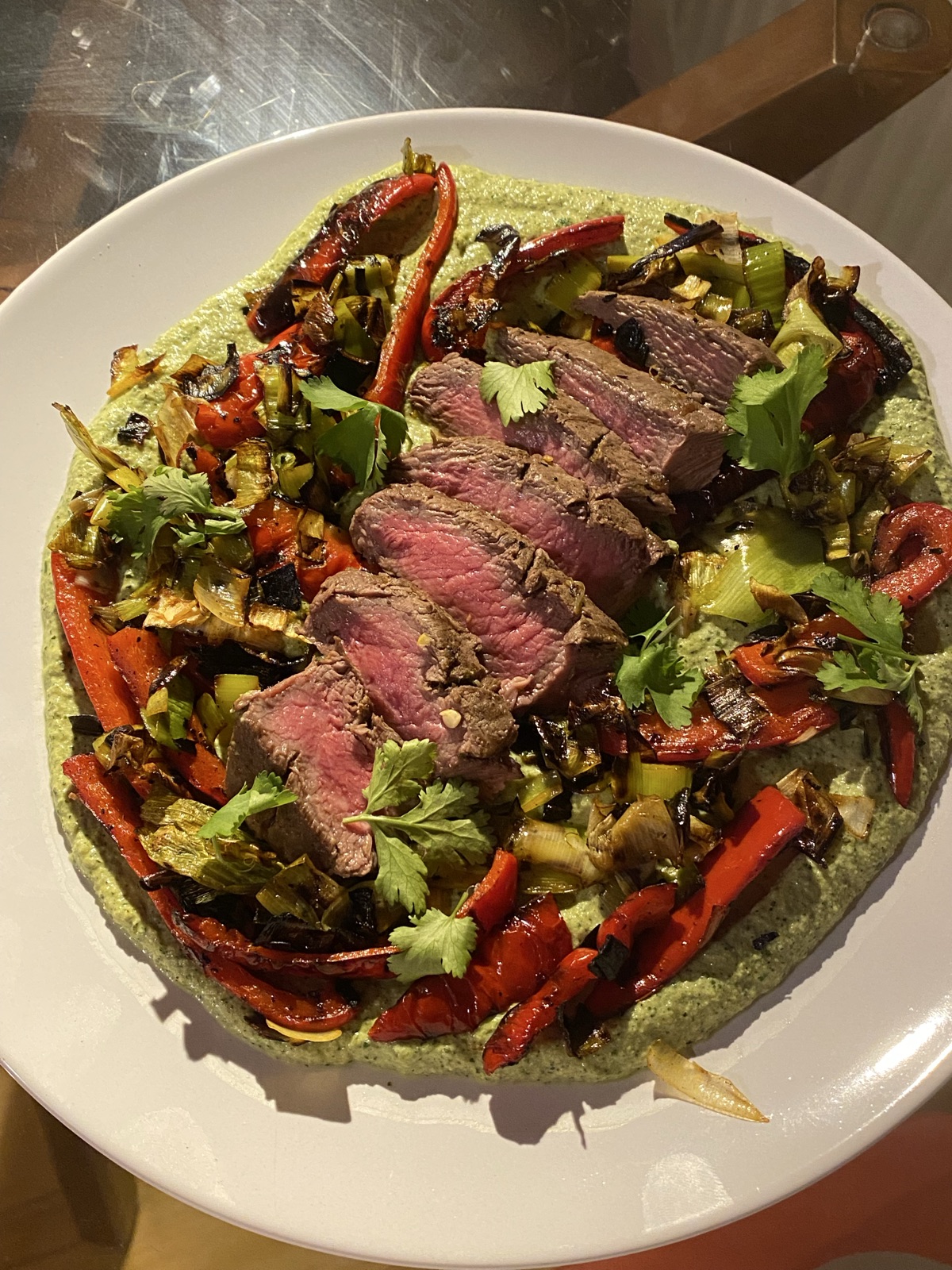 steak, charred leeks and peppers, ricotta and courgette pesto