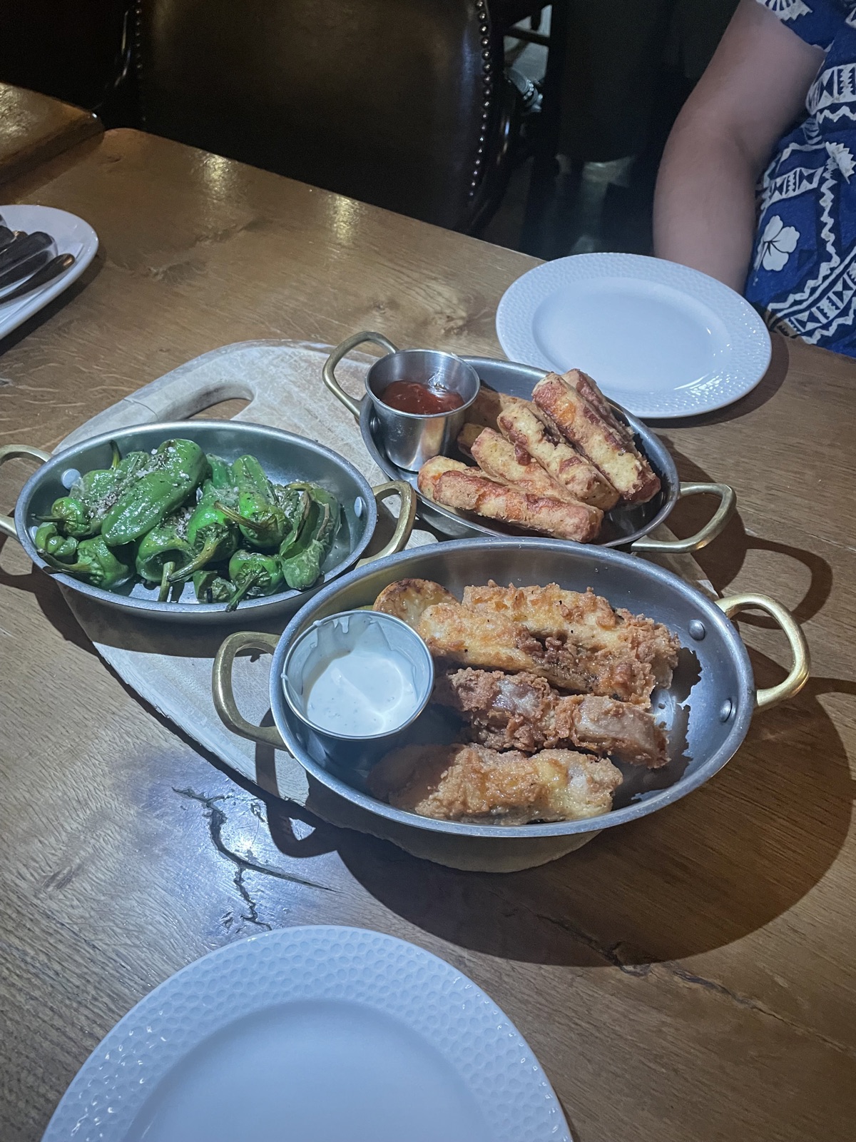 A vibrant and crowd-pleasing sharing board featuring a trio of distinct appetizers. This platter combines the smoky heat of blistered Padrón peppers with sea salt, the salty crunch of golden halloumi fries paired with sweet chili sauce, and tender buttermilk fried chicken strips with a cool creamy dip. Perfect for hosting a party or enjoying a tapas-style dinner at home.