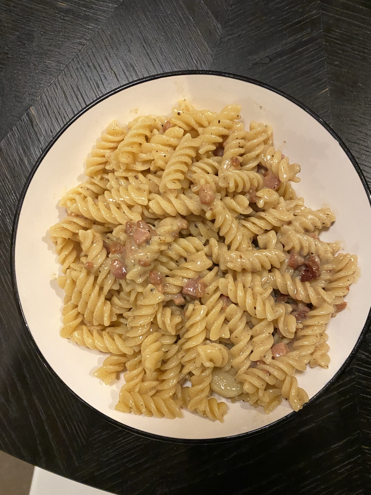 A comforting twist on the classic Roman Carbonara, using spiral fusilli pasta which perfectly catches the rich, silky sauce made from eggs, hard cheese, and savory cured pork. This 'pure carb' delight is finished with a generous amount of freshly cracked black pepper for that signature bite.