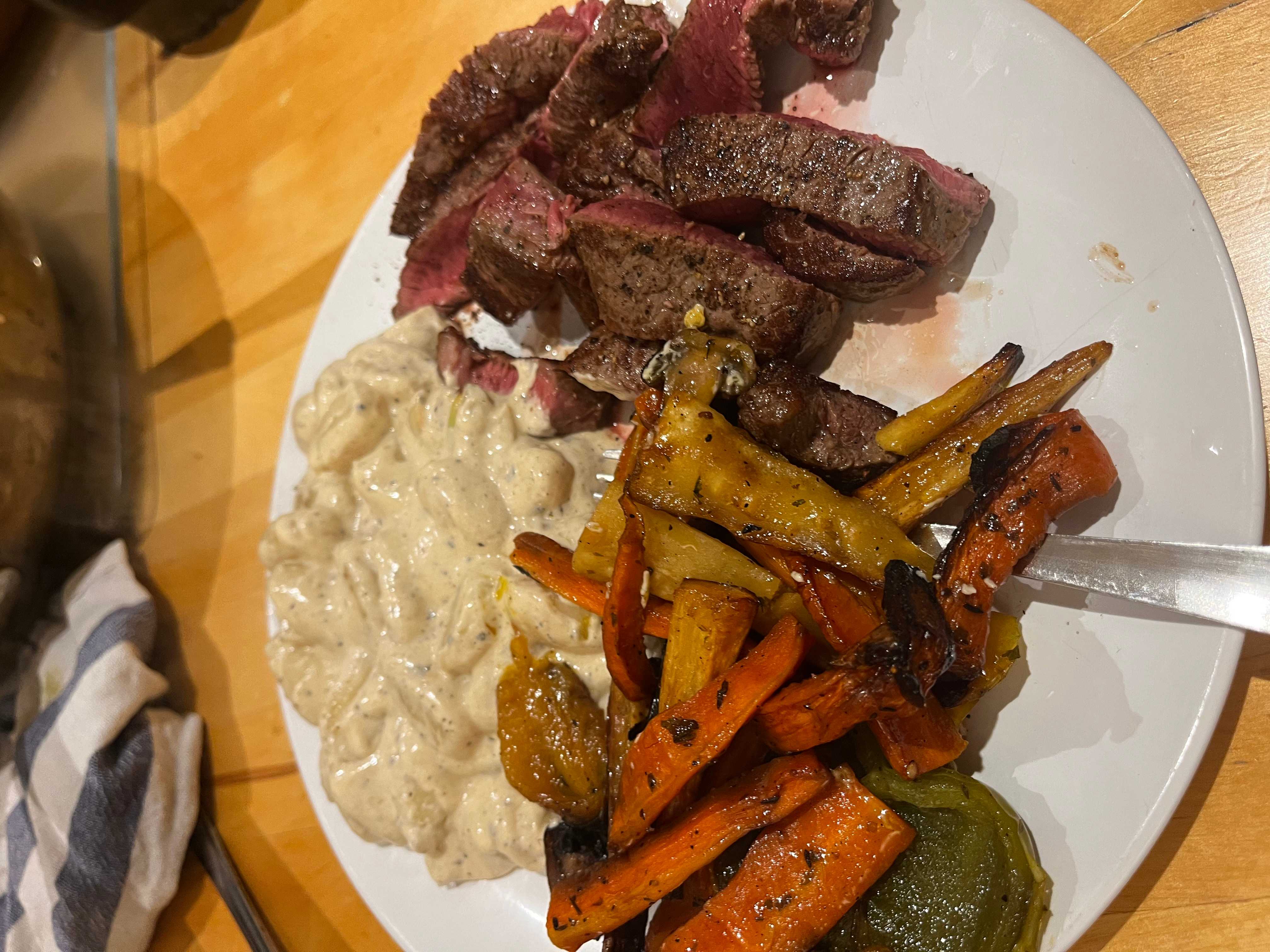 pan-seared steak with creamy gnocchi and roasted root vegetables