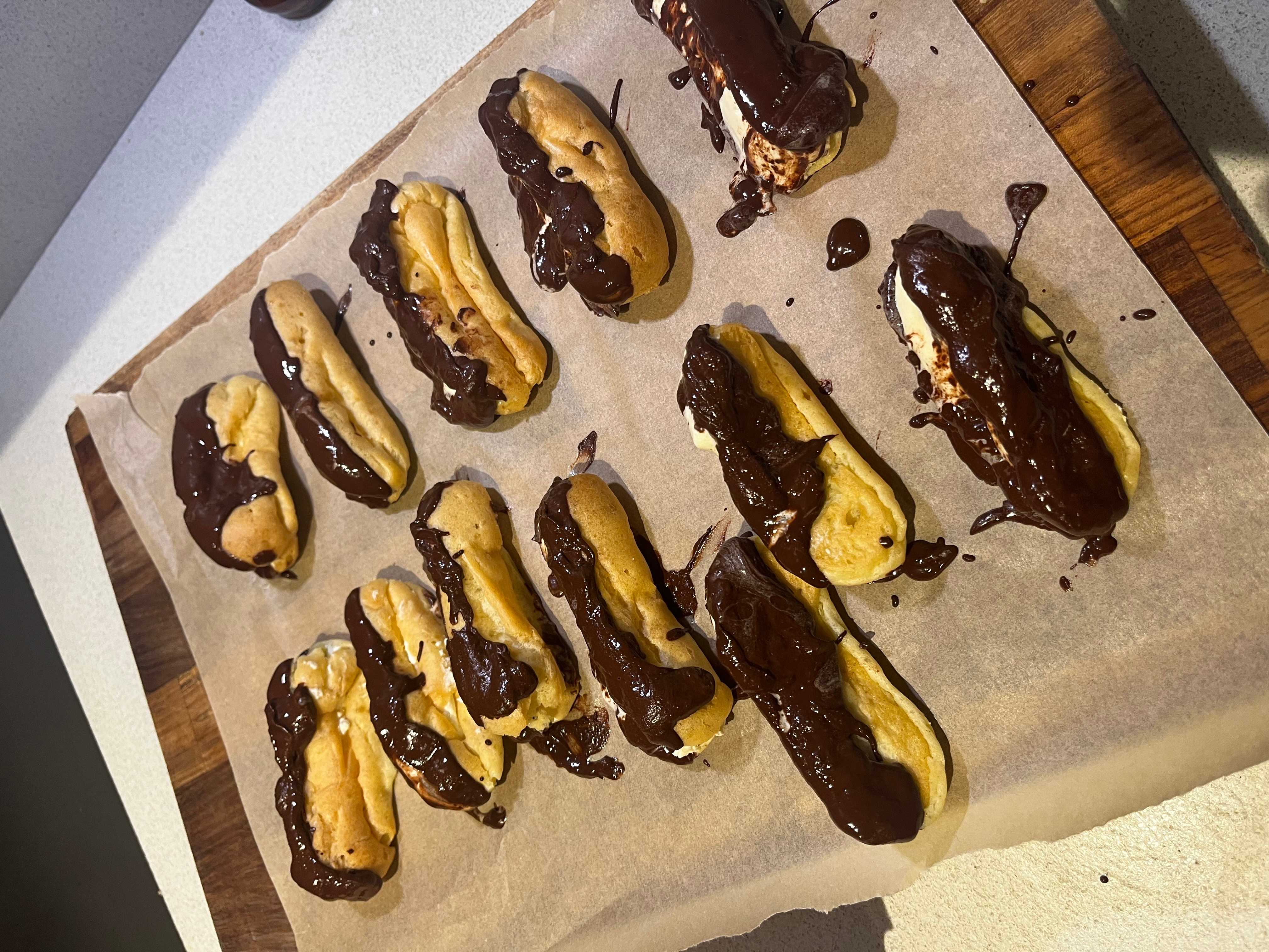 These elegant French pastries feature airy choux pastry shells filled with a smooth vanilla pastry cream and topped with a rich, glossy chocolate ganache. As seen in the images, this recipe guides you through making the dough, whisking the custard filling, and glazing the final baked treats.