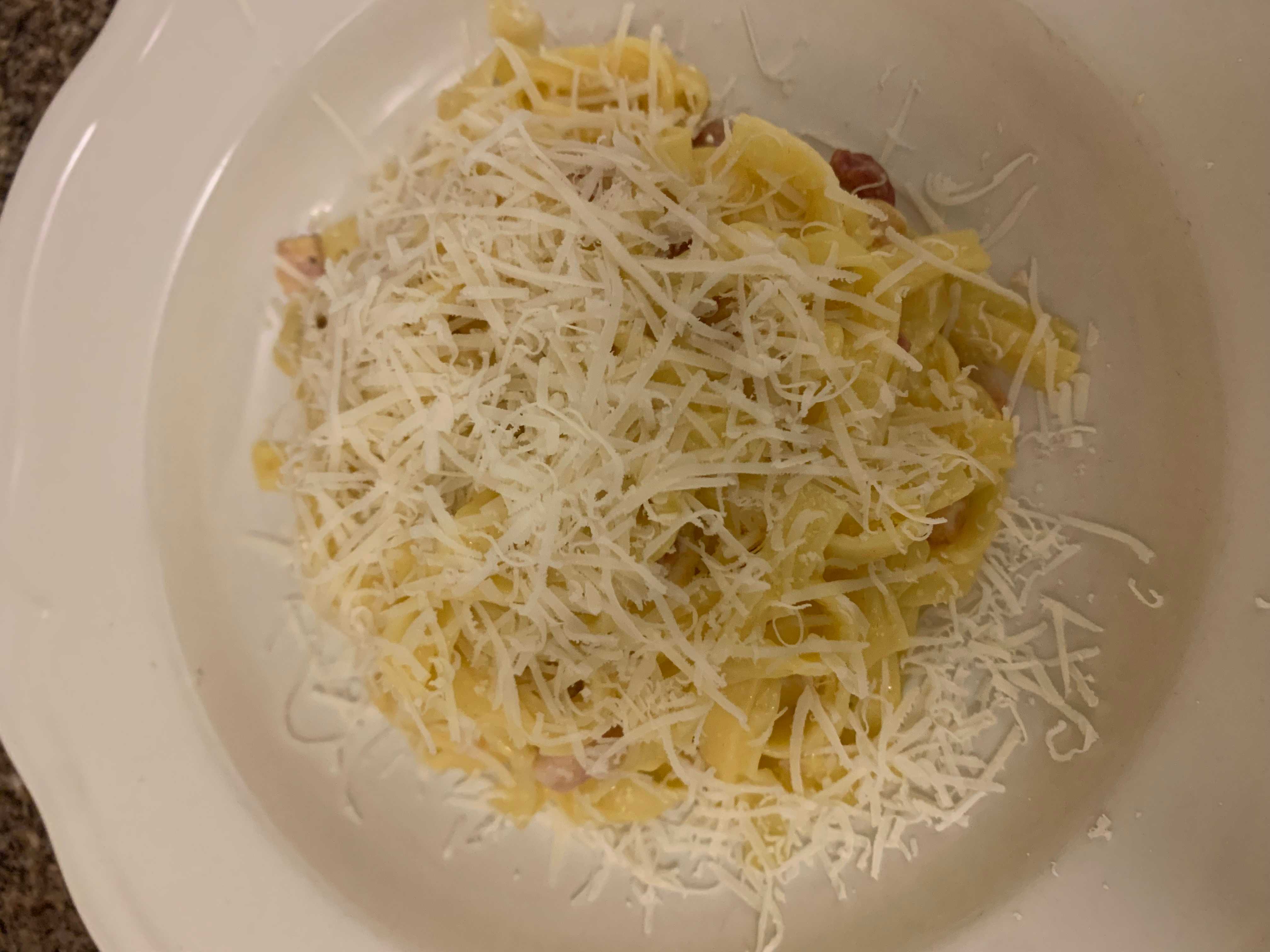 A rich and indulgent take on the classic Roman pasta dish, featuring ribbons of tagliatelle coated in a silky sauce made from eggs and Parmesan. This version incorporates smoked pancetta for depth, along with garlic and a touch of butter for extra richness, topped generously with grated cheese as pictured.